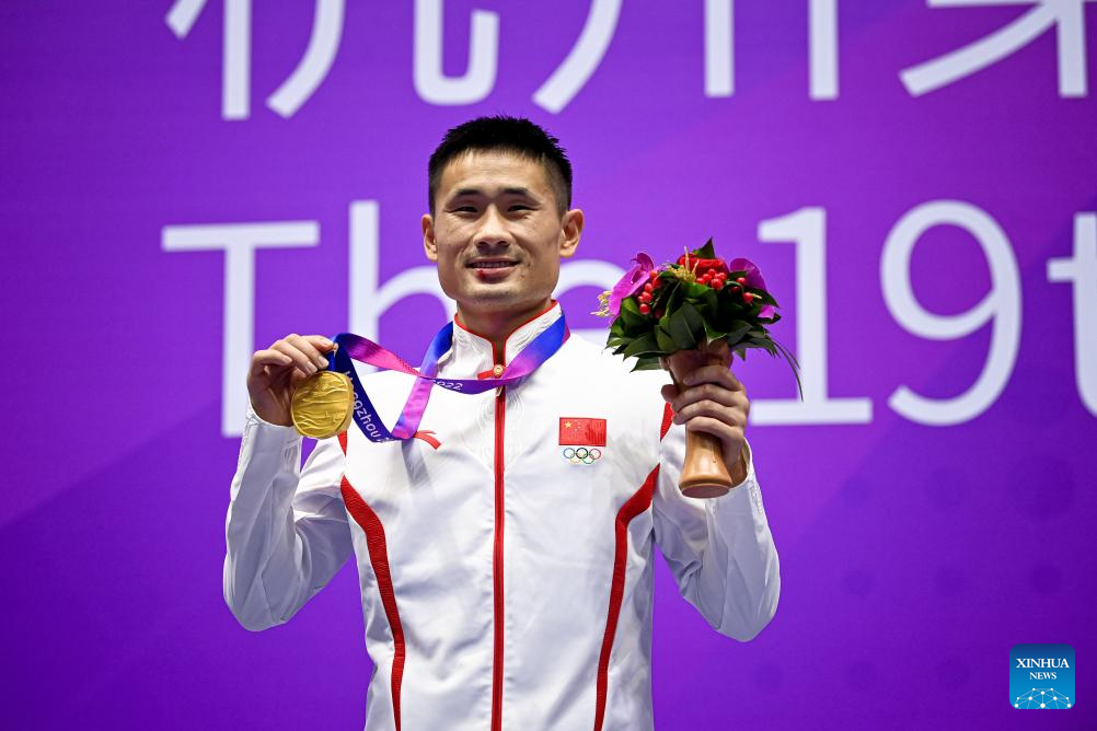 Gold medalist Jiang Haidong of China poses during the awarding ceremony for the Men's 56kg of Wushu at the 19th Asian Games in Hangzhou, east China's Zhejiang Province, Sept. 28, 2023. (Xinhua/Jiang Han)