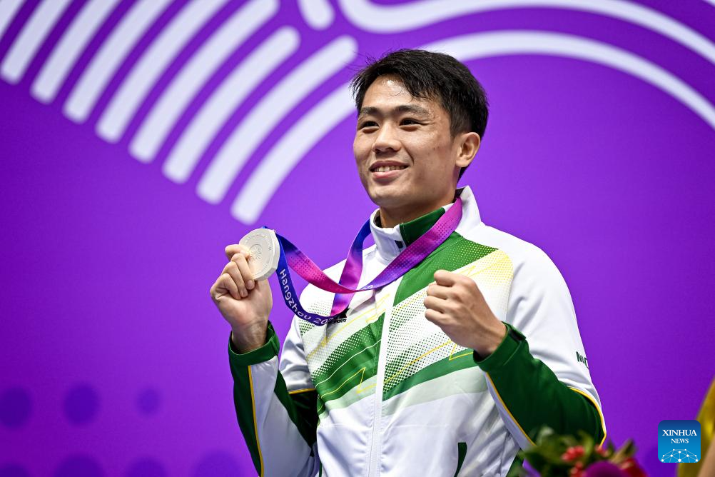 Silver medalist Cai Feilong of China's Macao poses during the awarding ceremony for the Men's 75kg of Wushu at the 19th Asian Games in Hangzhou, east China's Zhejiang Province, Sept. 28, 2023. (Xinhua/Jiang Han)