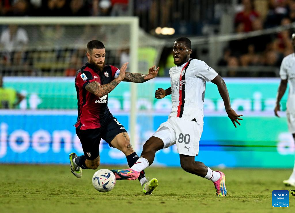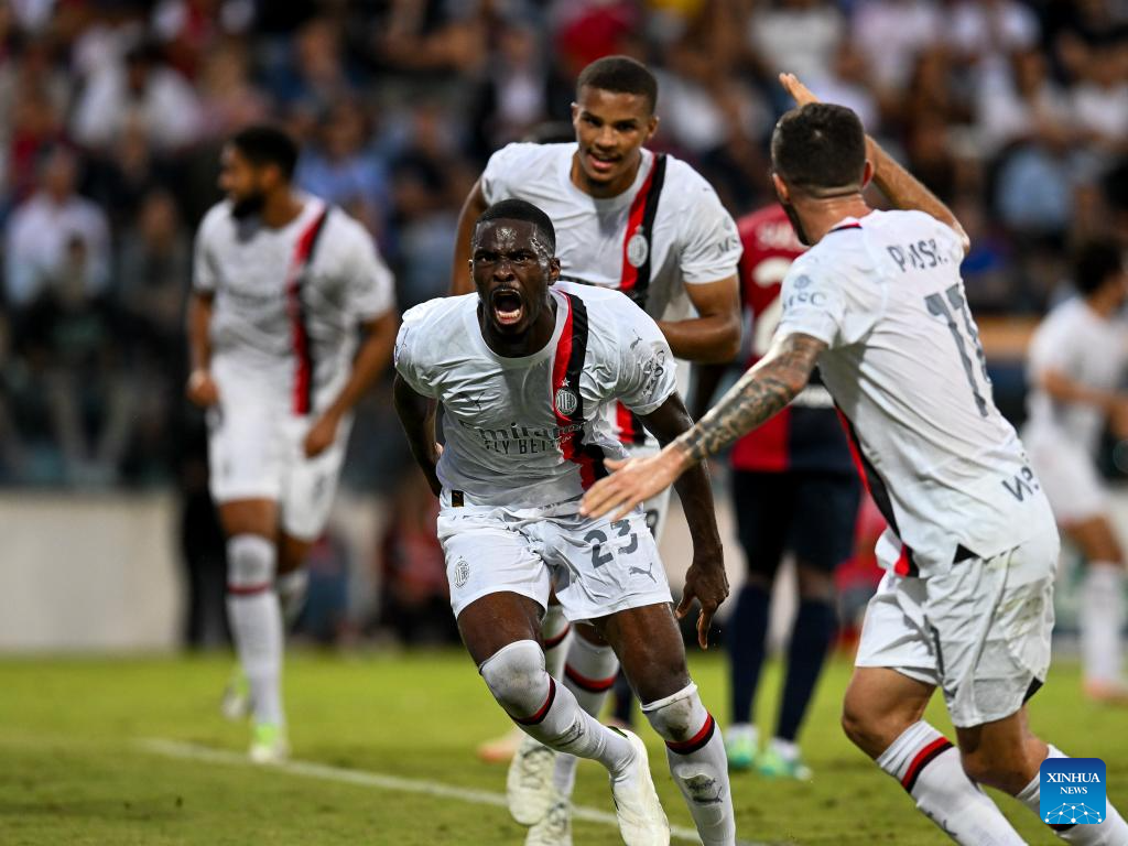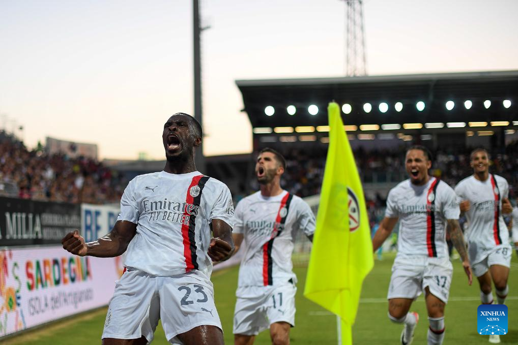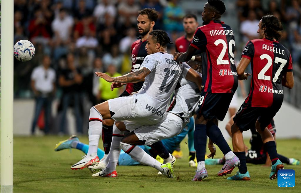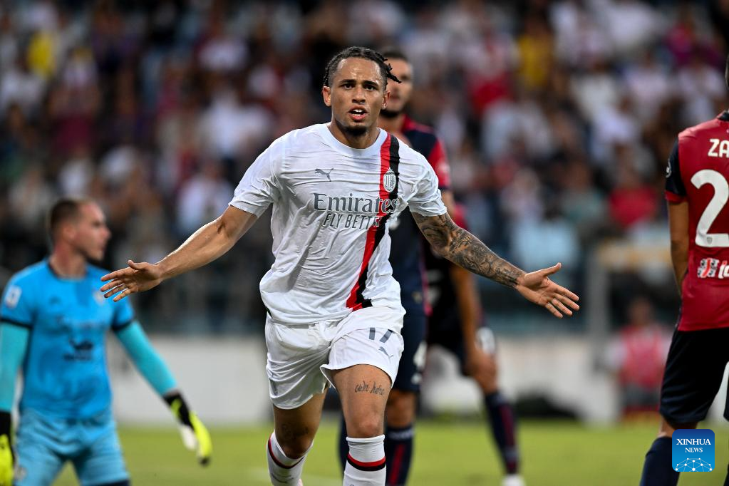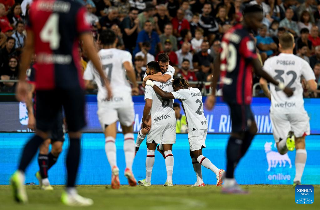 AC Milan's Noah Okafor (2nd L) scores his goal during a Serie A football match between AC Milan and Cagliari in Cagliari, Italy, on Sept. 27, 2023. (Photo by Daniele Mascolo/Xinhua)