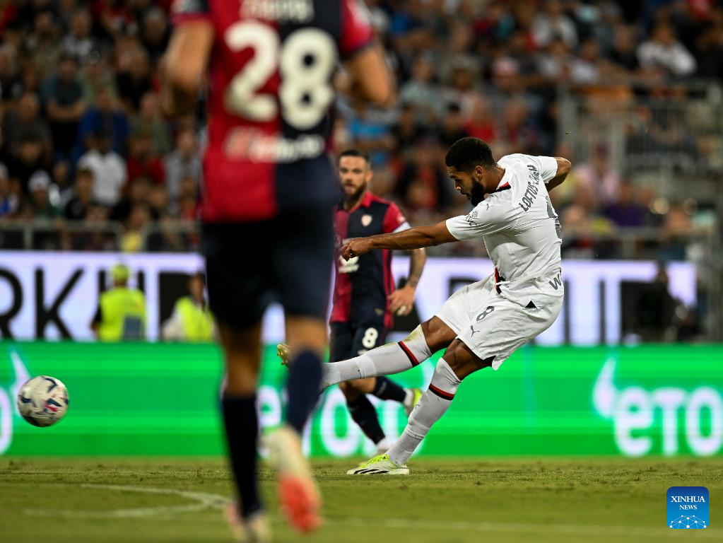 AC Milan's Ruben Lotfus-Cheek scores his goal during a Serie A football match between AC Milan and Cagliari in Cagliari, Italy, on Sept. 27, 2023. (Photo by Daniele Mascolo/Xinhua)