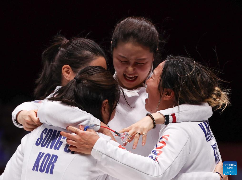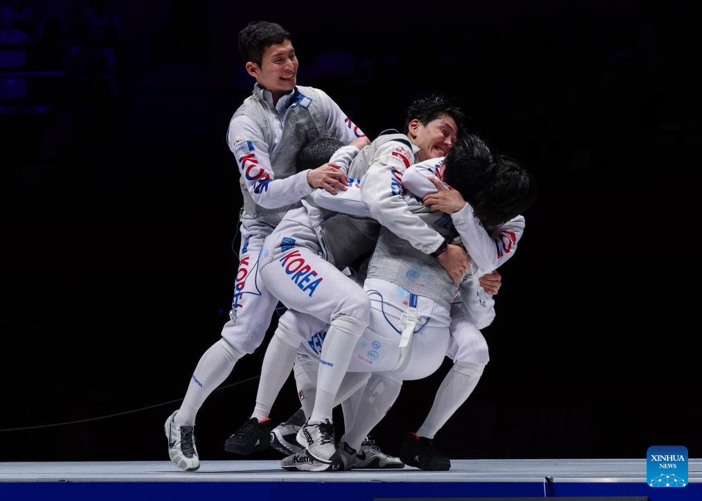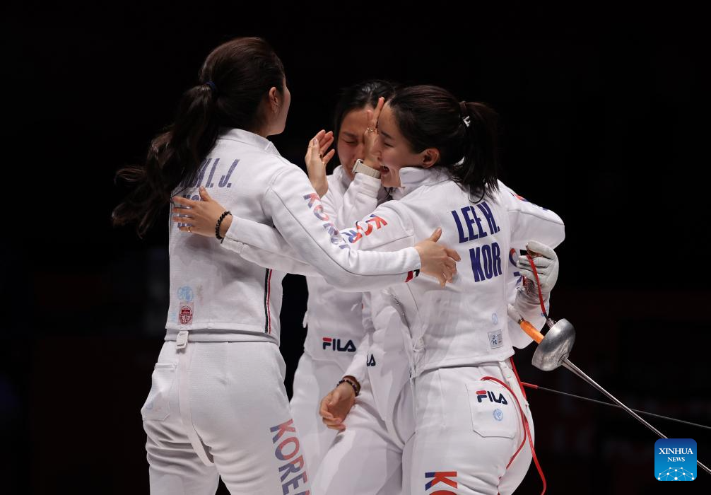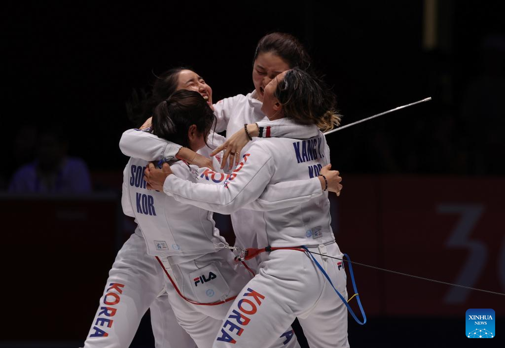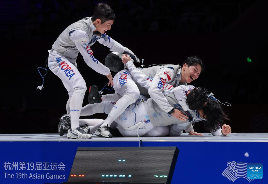Players of South Korea celebrate after the Women's Epee Team final of Fencing at the 19th Asian Games in Hangzhou, east China's Zhejiang Province, Sept. 27, 2023. (Xinhua/Yang Lei)