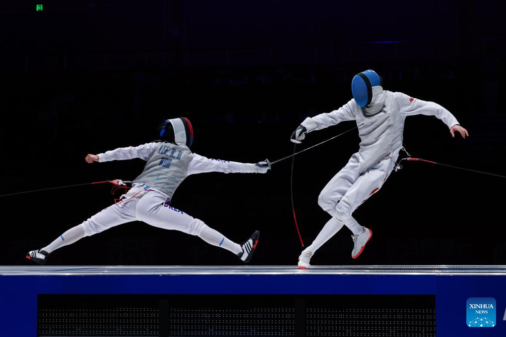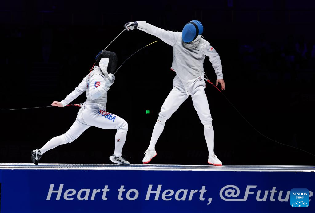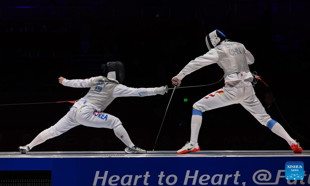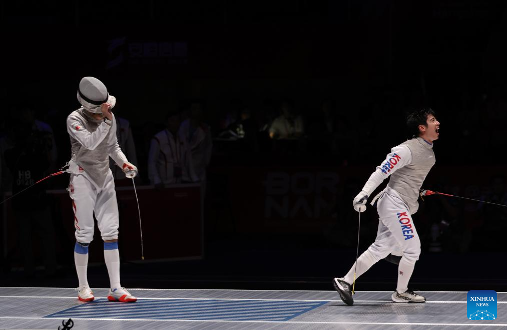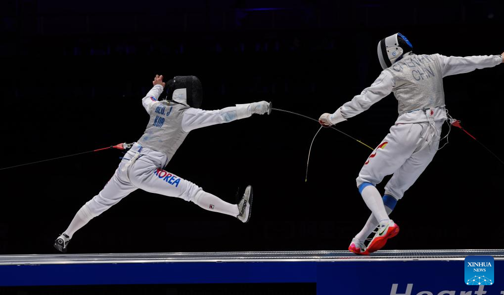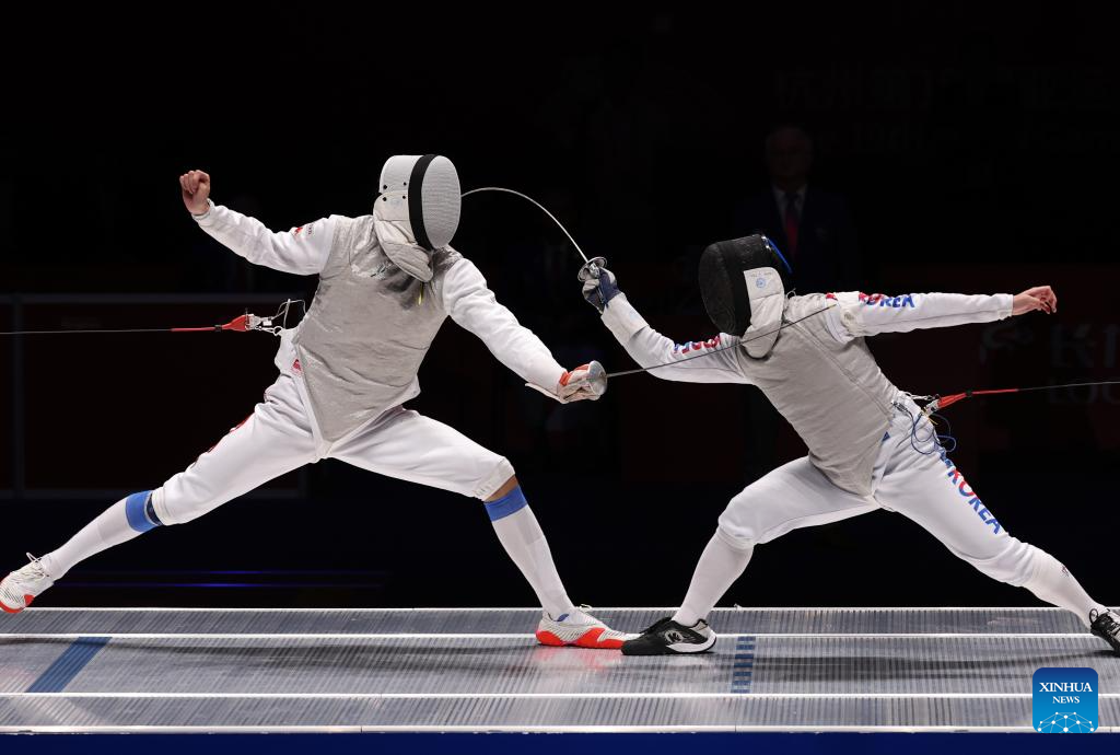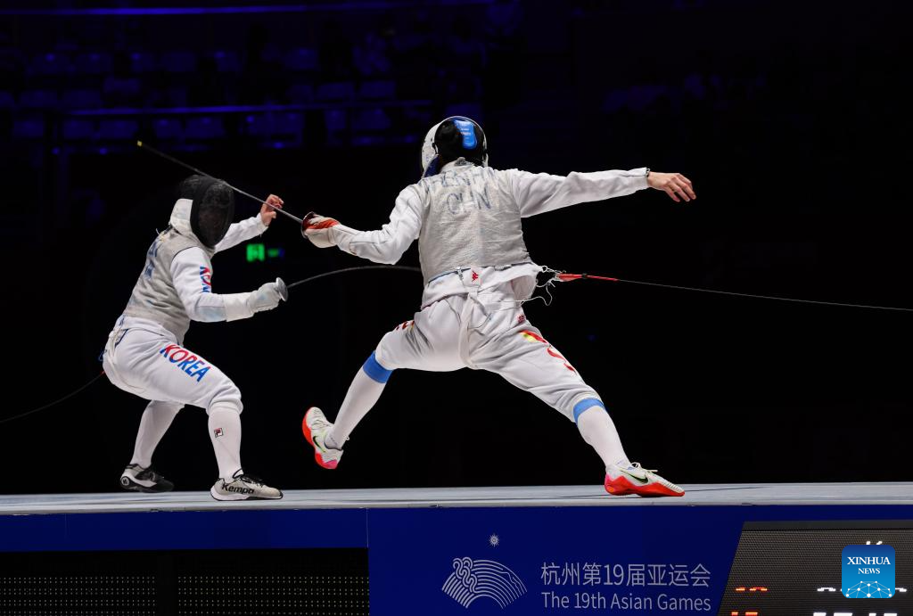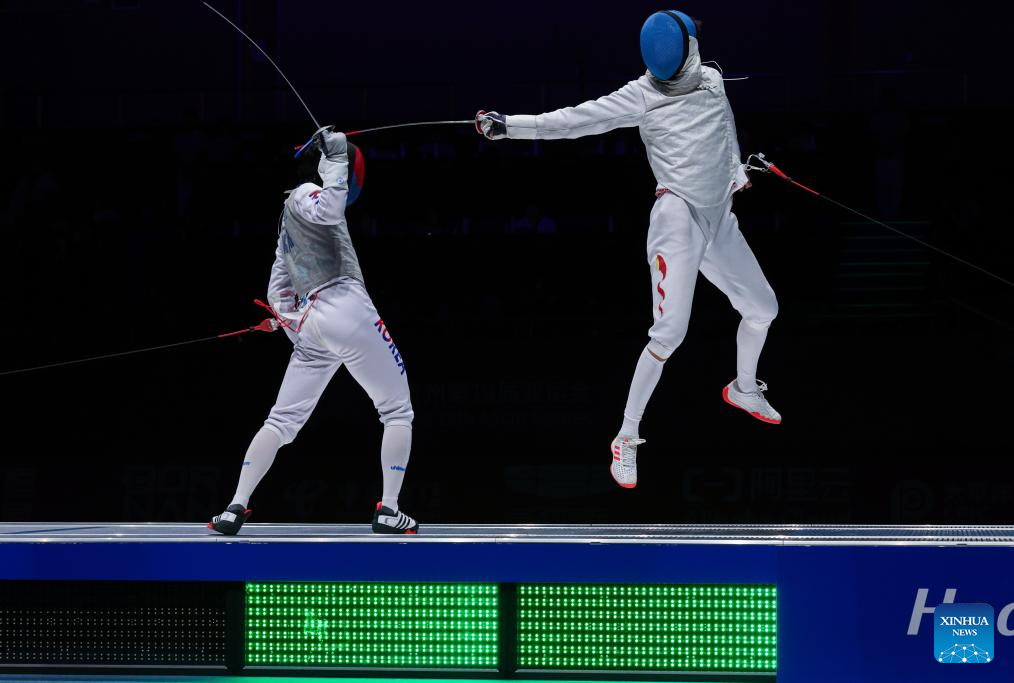 Xu Jie (R) of China competes against Heo Jun of South Korea during the Men's Foil Team Gold Medal match of Fencing at the 19th Asian Games in Hangzhou, east China's Zhejiang Province, Sept. 27, 2023. (Xinhua/Xu Yu)