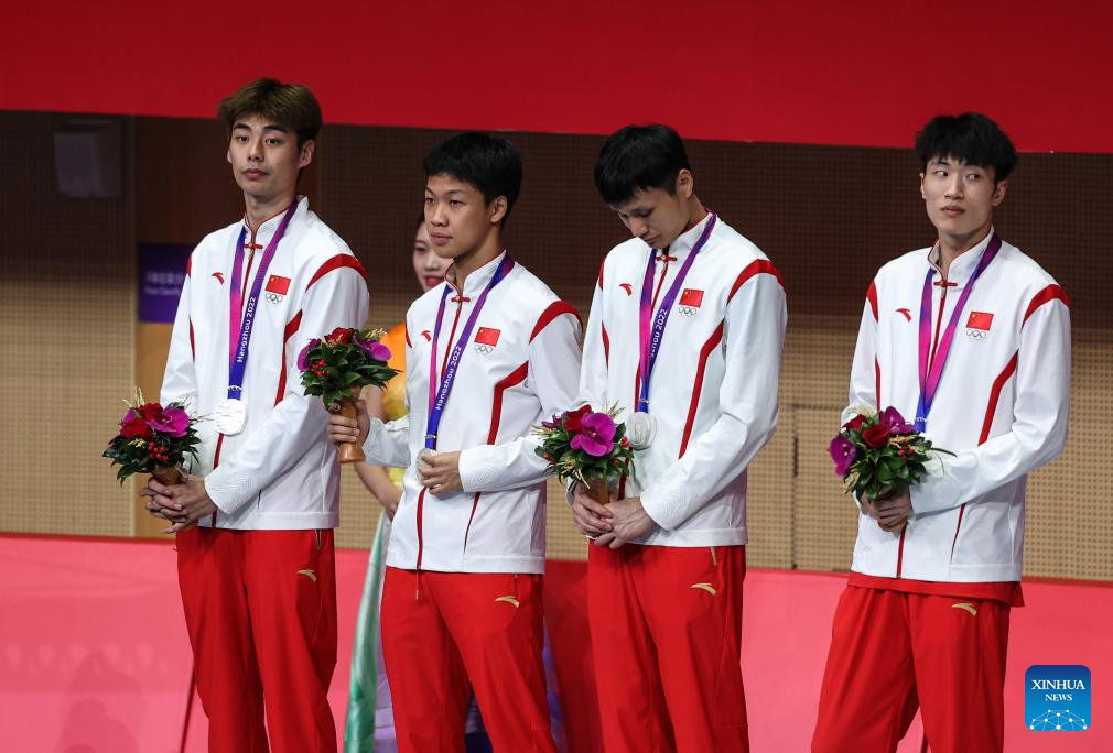 Silver medalists Team China attend the awarding ceremony for the Men's Foil Team Gold Medal match of Fencing at the 19th Asian Games in Hangzhou, east China's Zhejiang Province, Sept. 27, 2023. (Xinhua/Yang Lei)