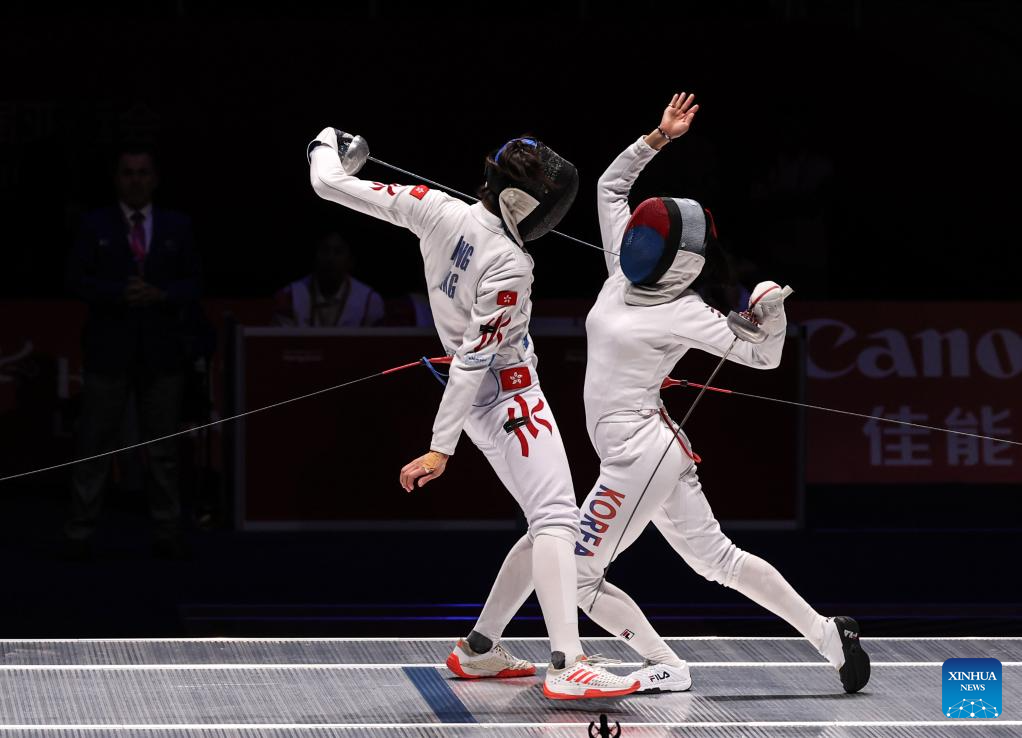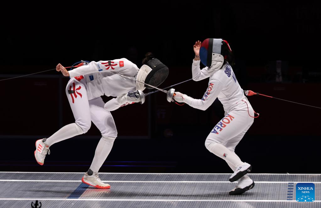 Song Sera of South Korea (R) competes against Kong Man Wai Vivian of China's Hong Kong during the Women's Epee Team final of Fencing at the 19th Asian Games in Hangzhou, east China's Zhejiang Province, Sept. 27, 2023. (Xinhua/Yang Lei)