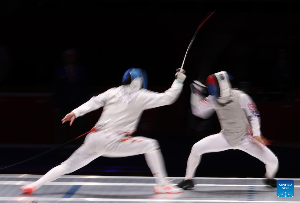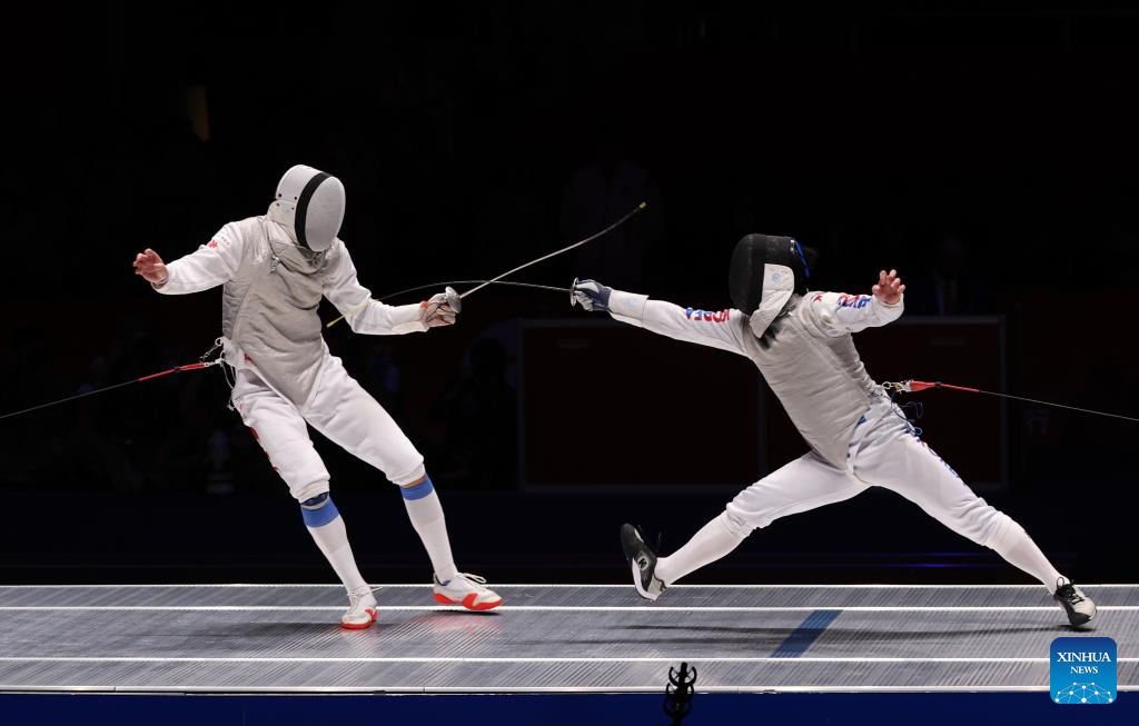 Xu Jie (L) of China competes during the Men's Foil Team Gold Medal match of Fencing at the 19th Asian Games in Hangzhou, east China's Zhejiang Province, Sept. 27, 2023. (Xinhua/Yang Lei)