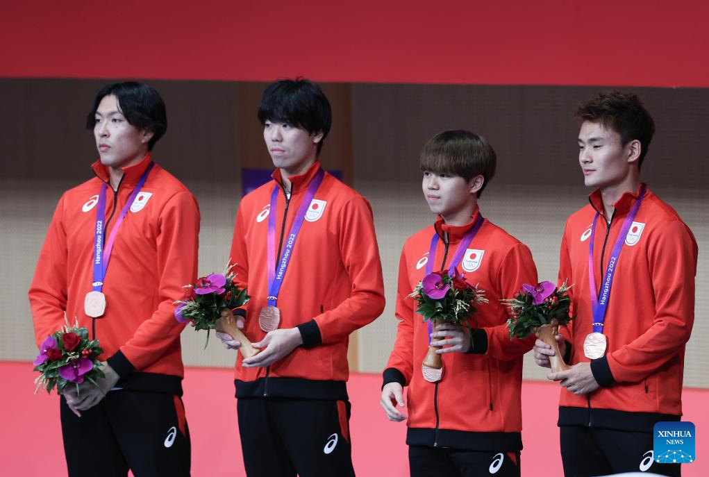 Bronze medalists Team Japan attend the awarding ceremony for the Men's Foil Team Gold Medal match of Fencing at the 19th Asian Games in Hangzhou, east China's Zhejiang Province, Sept. 27, 2023. (Xinhua/Yang Lei)
