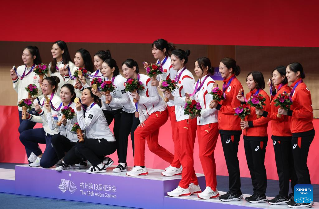 Medalists pose for photo after the awarding ceremony for the Women's Team Epee at the 19th Asian Games in Hangzhou, east China's Zhejiang Province, Sept. 27, 2023. (Xinhua/Yang Lei)