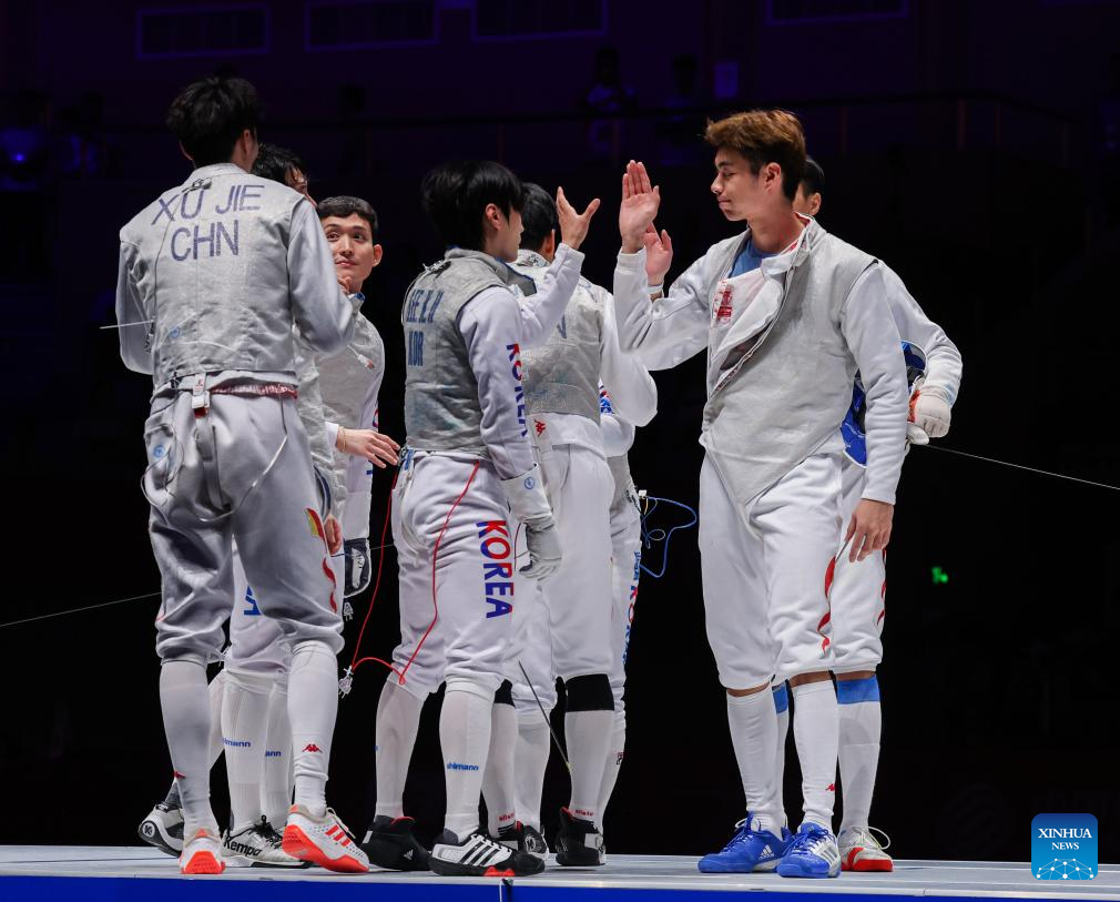 Players shake hands after the Men's Foil Team Gold Medal match of Fencing at the 19th Asian Games in Hangzhou, east China's Zhejiang Province, Sept. 27, 2023. (Xinhua/Xu Yu)