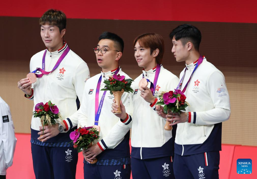Bronze medalists Team China's Hong Kong attend the awarding ceremony for the Men's Foil Team Gold Medal match of Fencing at the 19th Asian Games in Hangzhou, east China's Zhejiang Province, Sept. 27, 2023. (Xinhua/Yang Lei)