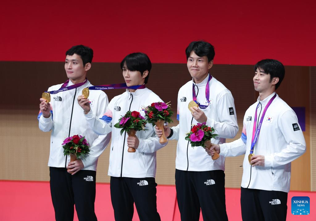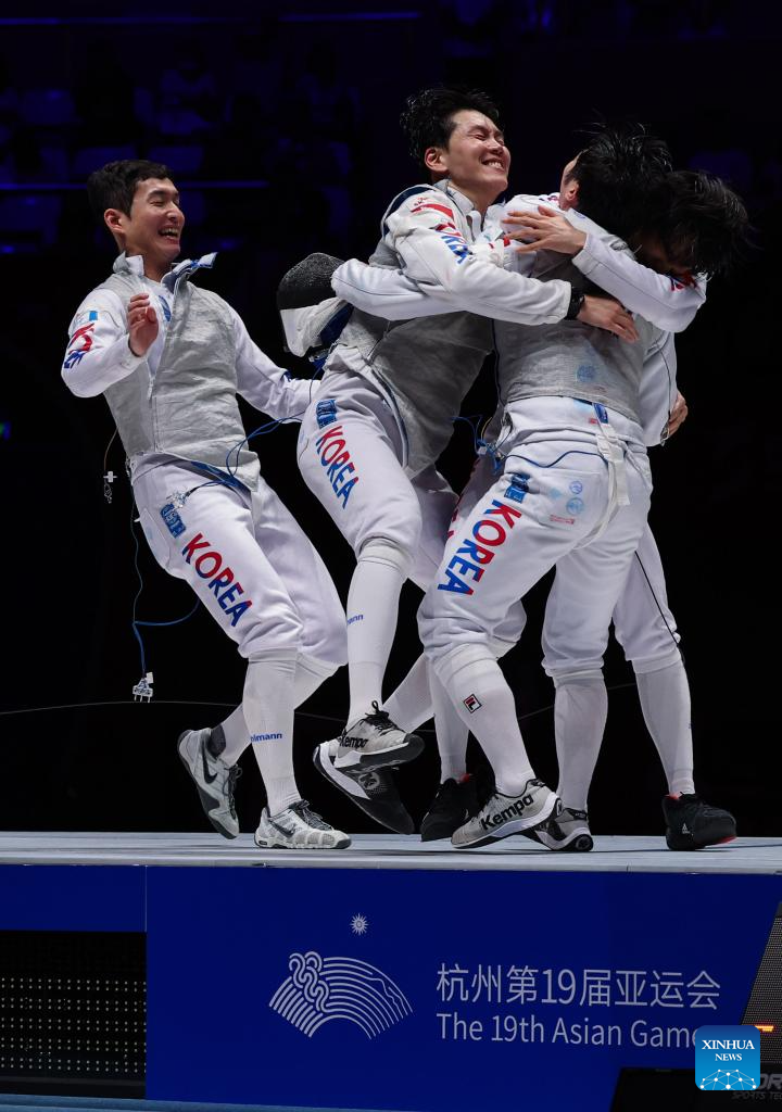 Players of South Korea celebrate winning the Men's Foil Team Gold Medal match of Fencing at the 19th Asian Games in Hangzhou, east China's Zhejiang Province, Sept. 27, 2023. (Xinhua/Xu Yu)