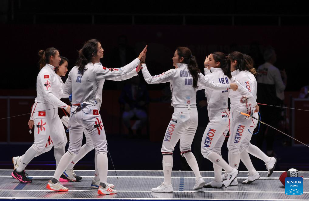 Players of South Korea and China's Hong Kong greet each other after the Women's Epee Team final of Fencing at the 19th Asian Games in Hangzhou, east China's Zhejiang Province, Sept. 27, 2023. (Xinhua/Yang Lei)