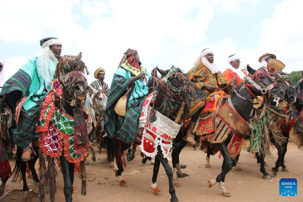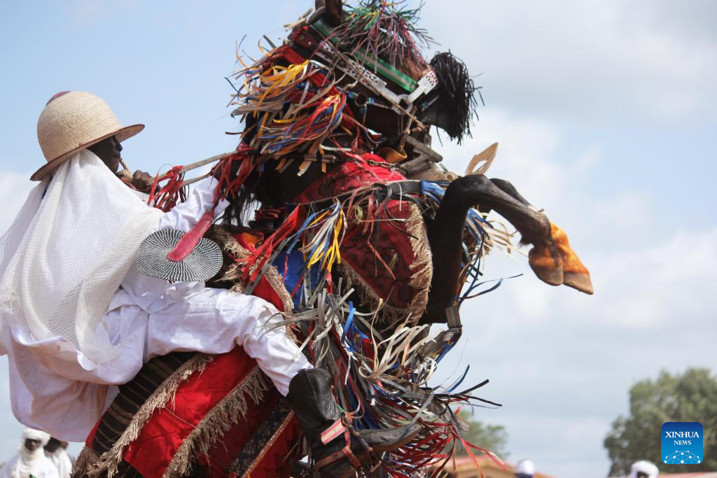People participate in the celebration of the Gaani festival in Nikki, Benin, Sept. 28, 2023. The two-day festival features traditional tribal dances and equestrian shows. It is the most important festival of the Bariba people of Benin and is designed to celebrate victory and joy. (Photo by Seraphin Zounyekpe/Xinhua)