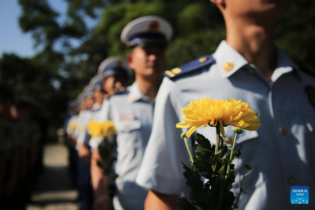 People attend a commemorative event held at the cemetery for martyrs of the Guangzhou Uprising in Guangzhou, south China's Guangdong Province, Sept. 30, 2023. China's 10th Martyrs' Day falls on Saturday. Commemoration ceremonies were held across the country to honor fallen national heroes. (Xinhua/Lu Hanxin)