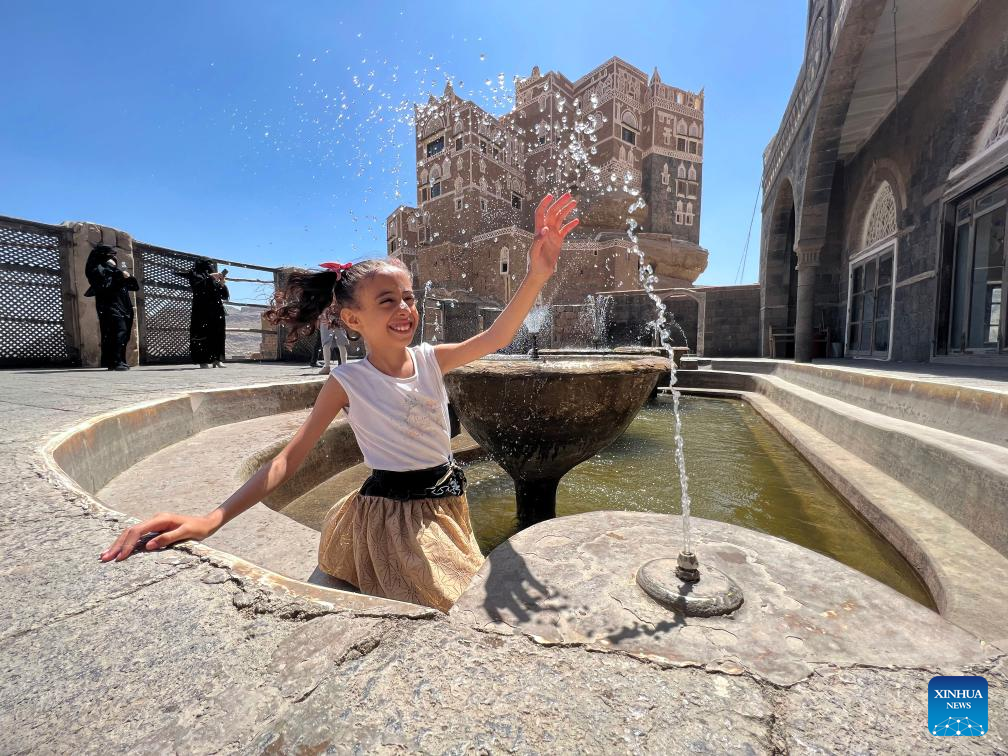 A girl enjoys the water sprayed from a fountain at the Dar al-Hajar (Rock Palace), north of Sanaa, Yemen, Sept. 29, 2023. (Photo by Mohammed Mohammed/Xinhua)