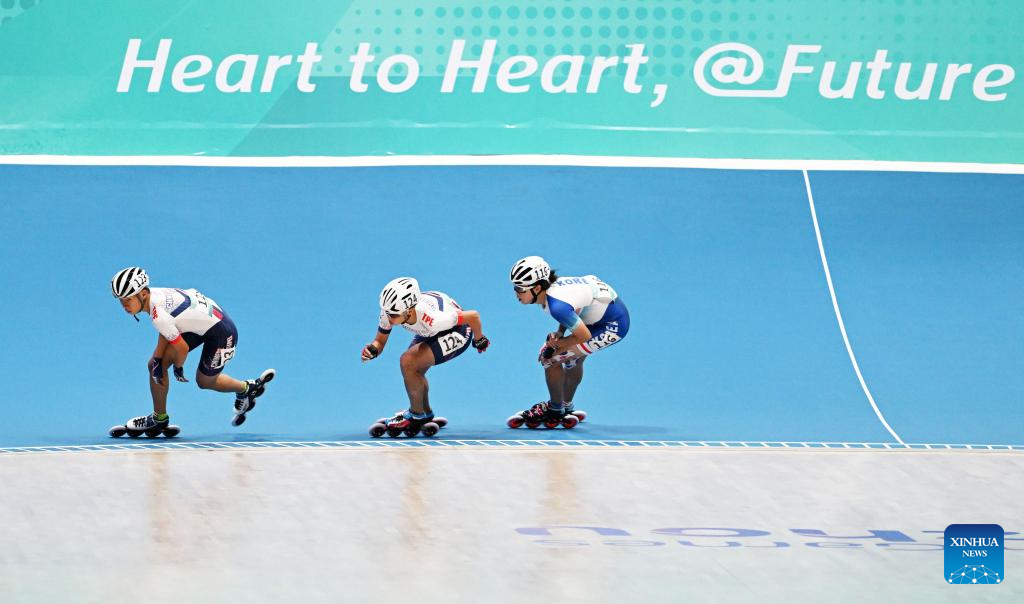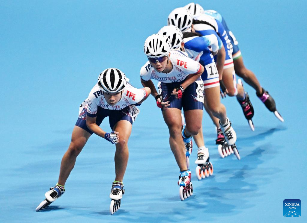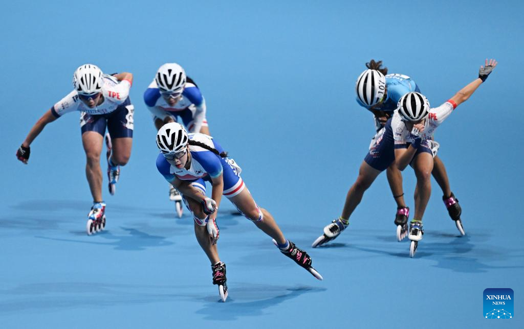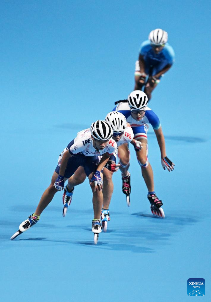 Shih Pei-Yu (1st L) of Chinese Taipei competes during the Women's Speed Skating 10000m Point-Elimination Race Final of Roller Skating at the 19th Asian Games in Hangzhou, east China's Zhejiang Province, Sept. 30, 2023. (Xinhua/Chen Yehua)