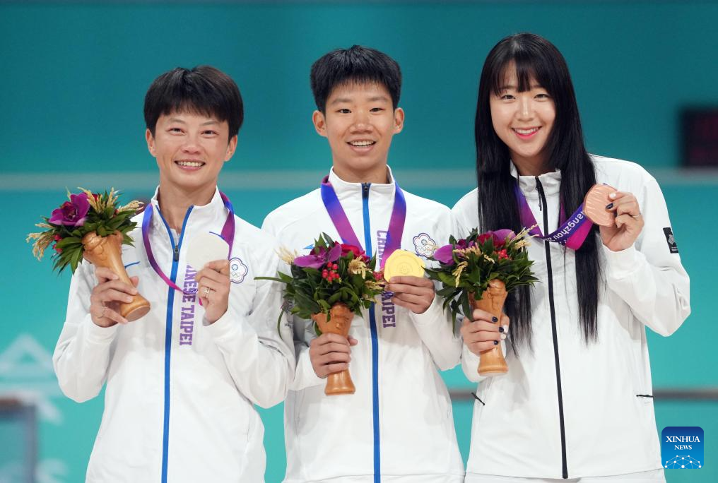 Gold medalist Shih Pei-Yu (C), sliver medalist Yang Ho-Chen (L) of Chinese Taipei and bronze medalist Yu Garam of South Korea pose during the awarding ceremony for the Women's Speed Skating 10000m Point-Elimination Race of Roller Skating at the 19th Asian Games in Hangzhou, east China's Zhejiang Province, Sept. 30, 2023. (Xinhua/Chen Yehua)