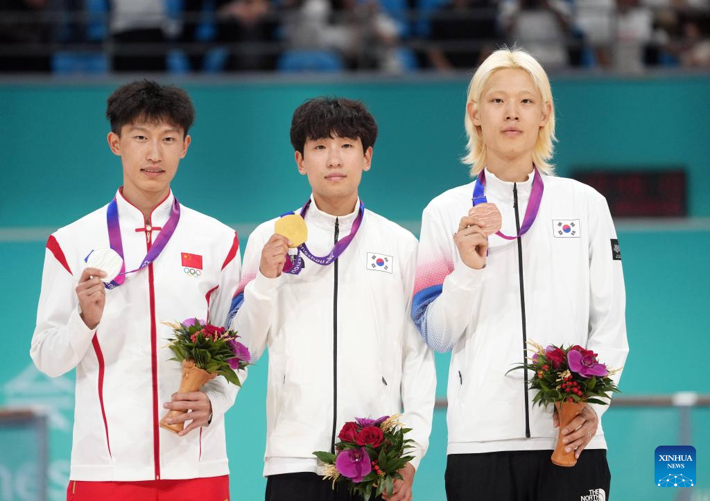 Gold medalist Jeong Byeonghee (C) of South Korea, silver medalist Zhang Zhenhai (L) of China, and bronze medalist Choi Inho of South Korea attend the awarding ceremony for the Men's Speed Skating 10000m Point-Elimination Race of Roller Skating at the 19th Asian Games in Hangzhou, east China's Zhejiang Province, Sept. 30, 2023. (Xinhua/Chen Yehua)