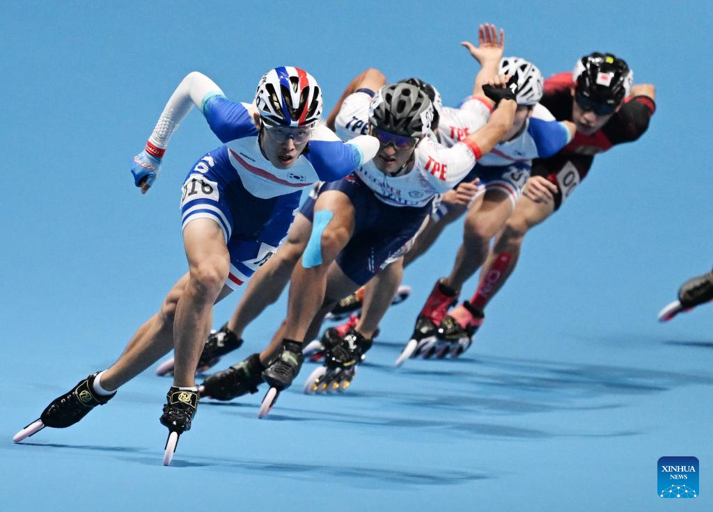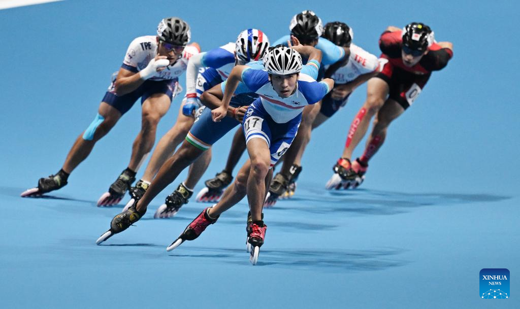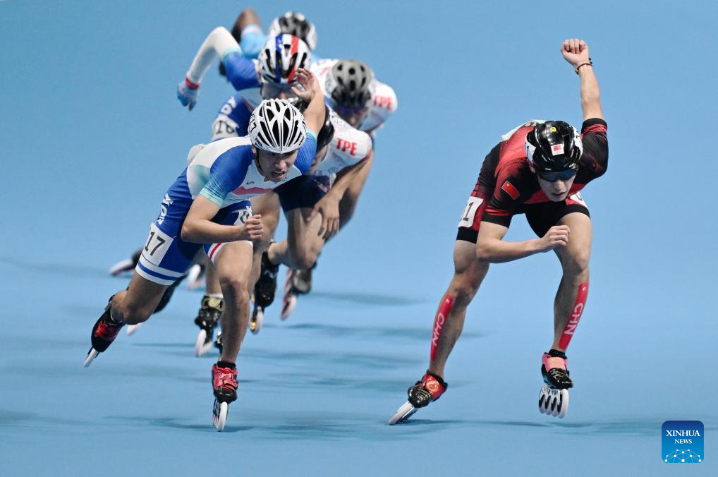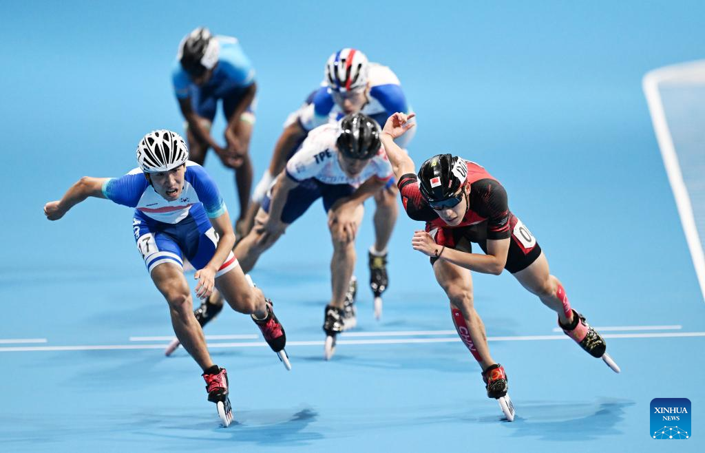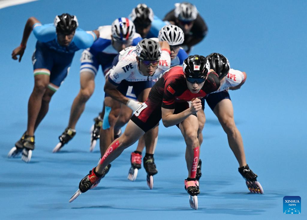 Zhang Zhenhai (front) of China competes during the Men's Speed Skating 10000m Point-Elimination Race Final of Roller Skating at the 19th Asian Games in Hangzhou, east China's Zhejiang Province, Sept. 30, 2023. (Xinhua/Chen Yehua)