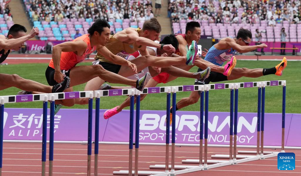 Zhu Shenglong (2nd R) of China competes during the Men's 110m Hurdles Heat of Athletics at the 19th Asian Games in Hangzhou, east China's Zhejiang Province, Oct. 1, 2023. (Xinhua/Sun Fei)