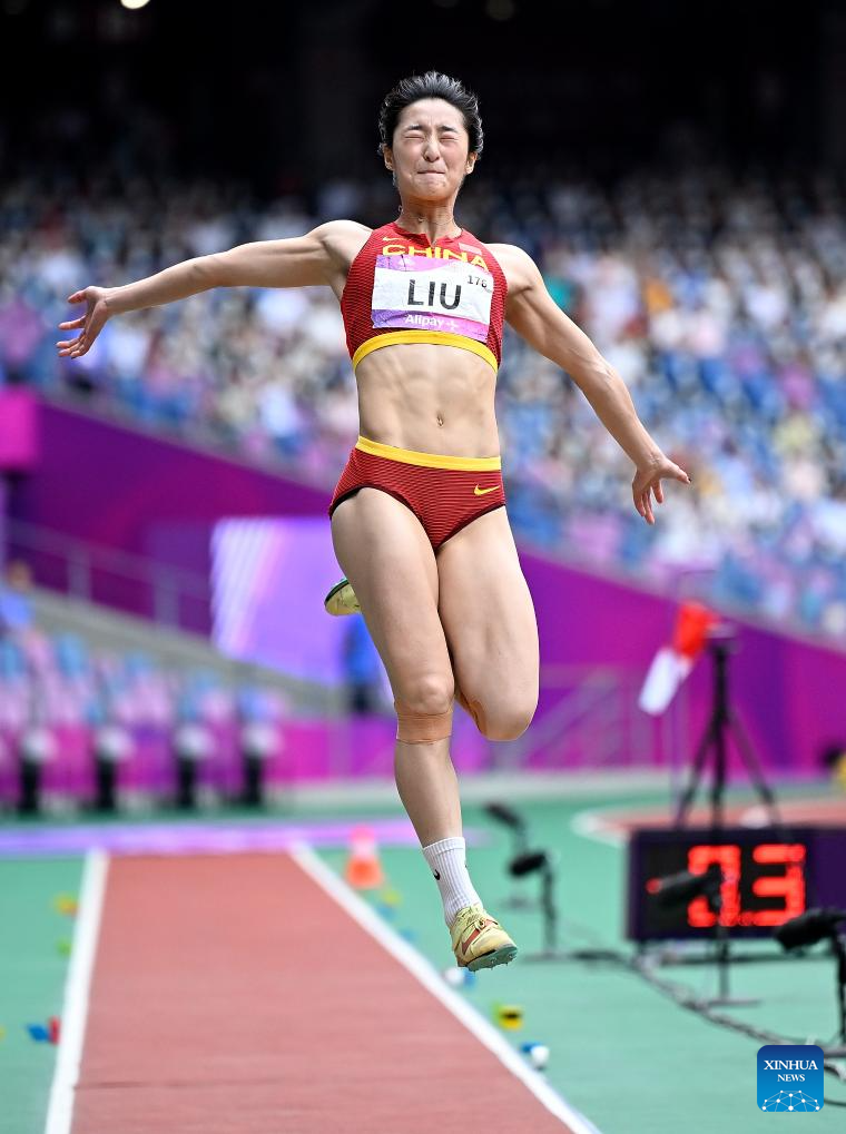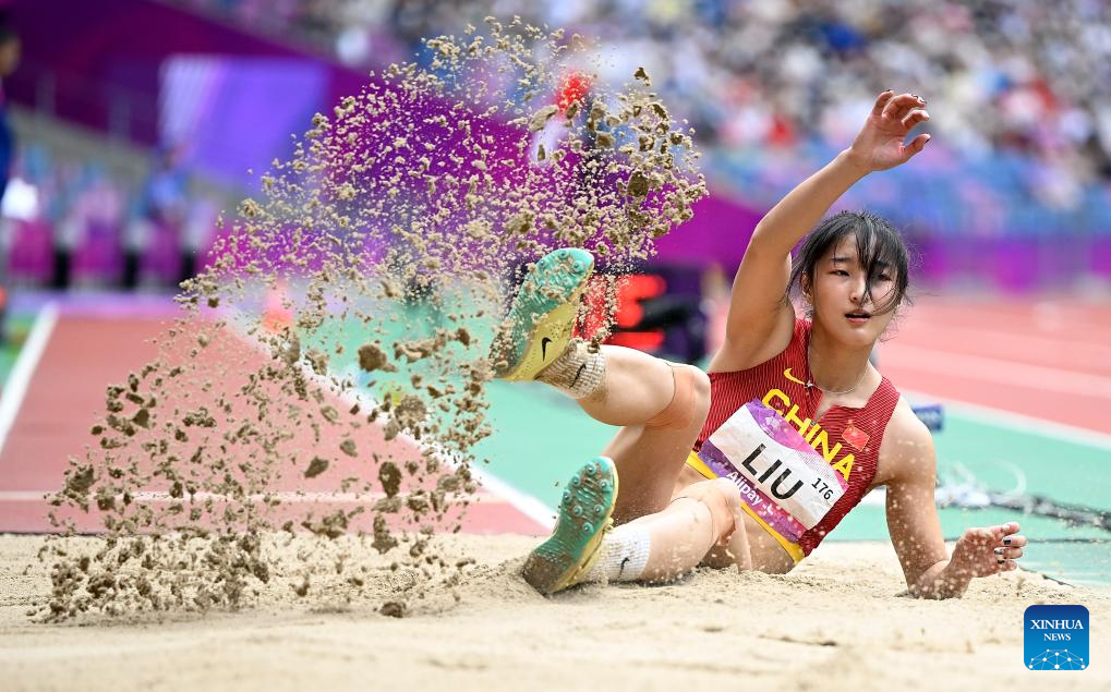 Liu Jingyi of China competes during the Women's Heptathlon Long Jump of Athletics at the 19th Asian Games in Hangzhou, east China's Zhejiang Province, Oct. 1, 2023. (Xinhua/Song Yanhua)