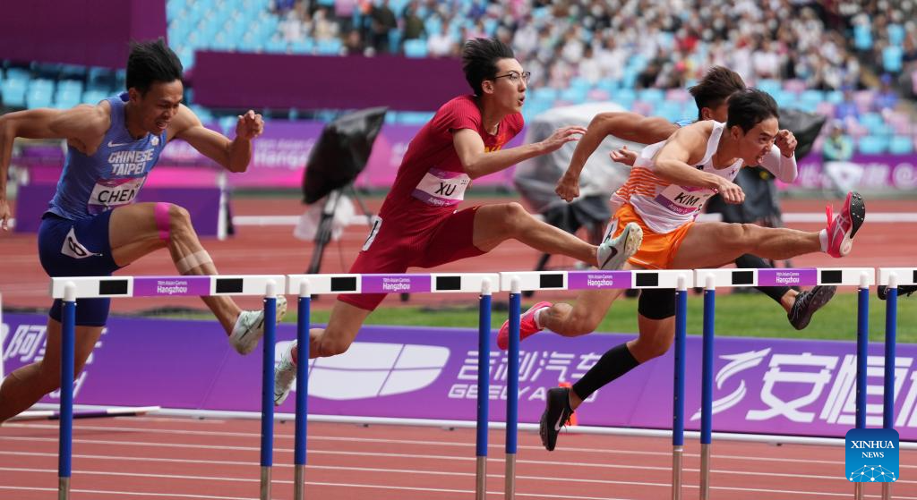 Xu Zhuoyi (2nd L) of China competes during the Men's 110m Hurdles Heat of Athletics at the 19th Asian Games in Hangzhou, east China's Zhejiang Province, Oct. 1, 2023. (Xinhua/Sun Fei)