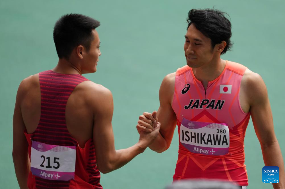 Zhu Shenglong (C) of China greets Ishikawa Shuhei of Japan after the Men's 110m Hurdles Heat of Athletics at the 19th Asian Games in Hangzhou, east China's Zhejiang Province, Oct. 1, 2023. (Xinhua/Jiang Wenyao)