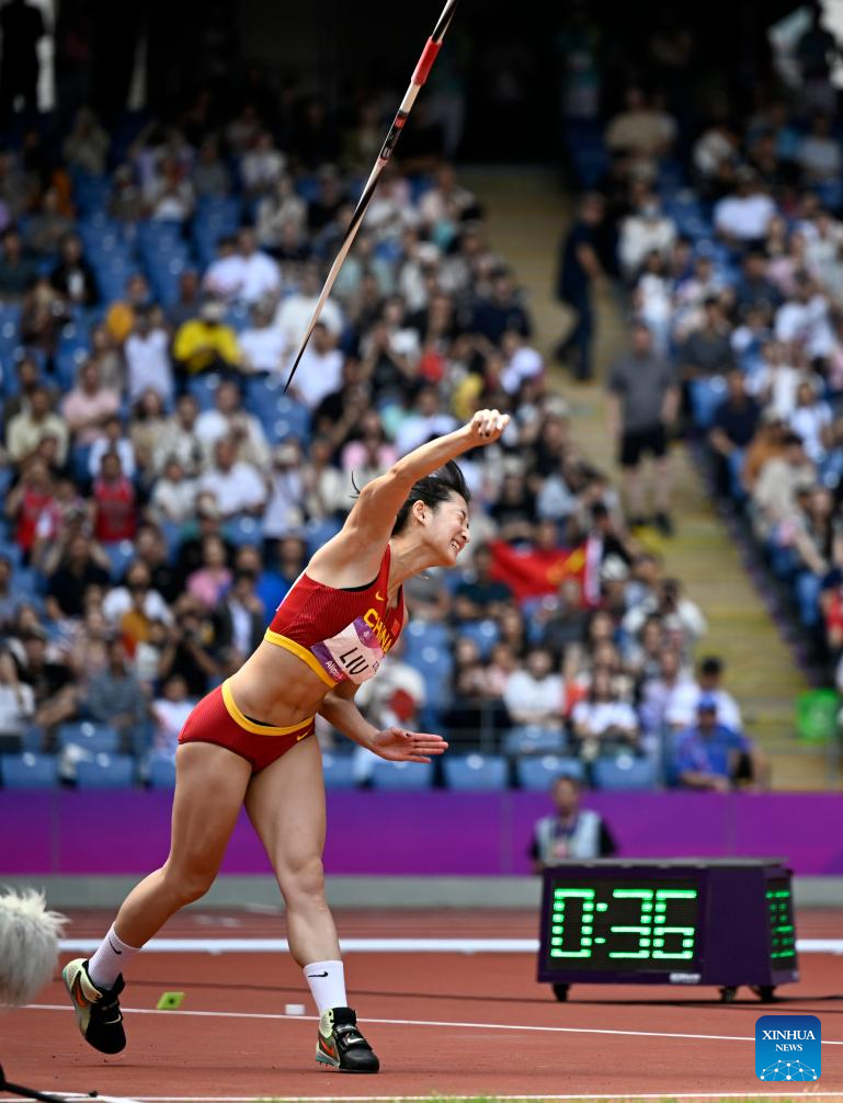 Zheng Ninali of China competes during the Women's Heptathlon Javelin Throw of Athletics at the 19th Asian Games in Hangzhou, east China's Zhejiang Province, Oct. 1, 2023. (Xinhua/Sun Fei)