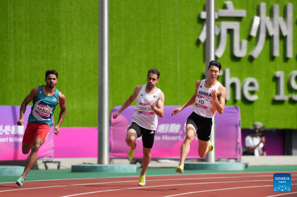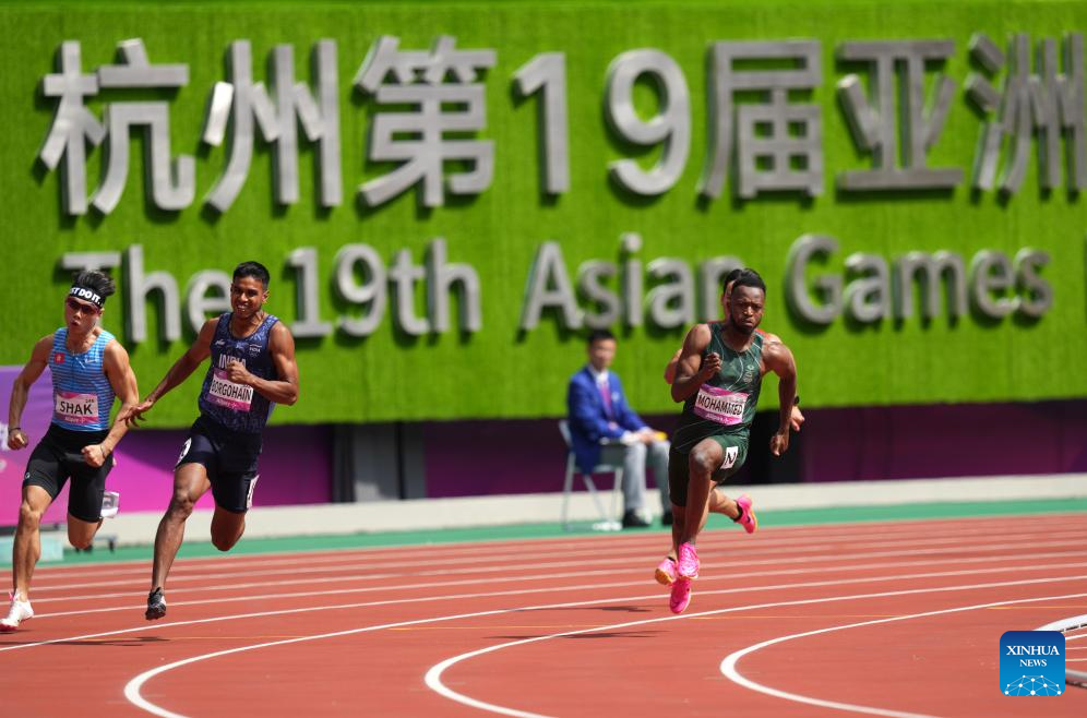 Athletes compete during the Men's 200m Heat of Athletics at the 19th Asian Games in Hangzhou, east China's Zhejiang Province, Oct. 1, 2023. (Xinhua/Sun Fei)