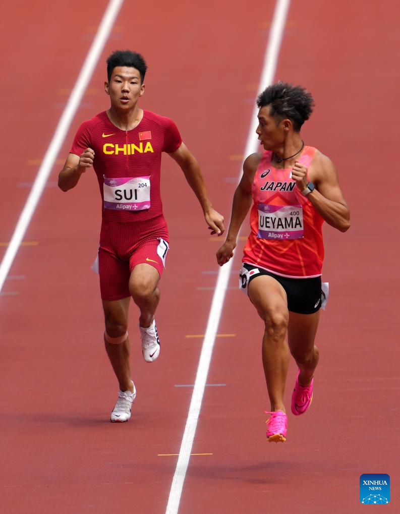Sui Gaofei (L) of China and Ueyama Koki of Japan compete during the Men's 200m Heat of Athletics at the 19th Asian Games in Hangzhou, east China's Zhejiang Province, Oct. 1, 2023. (Xinhua/Jiang Wenyao)