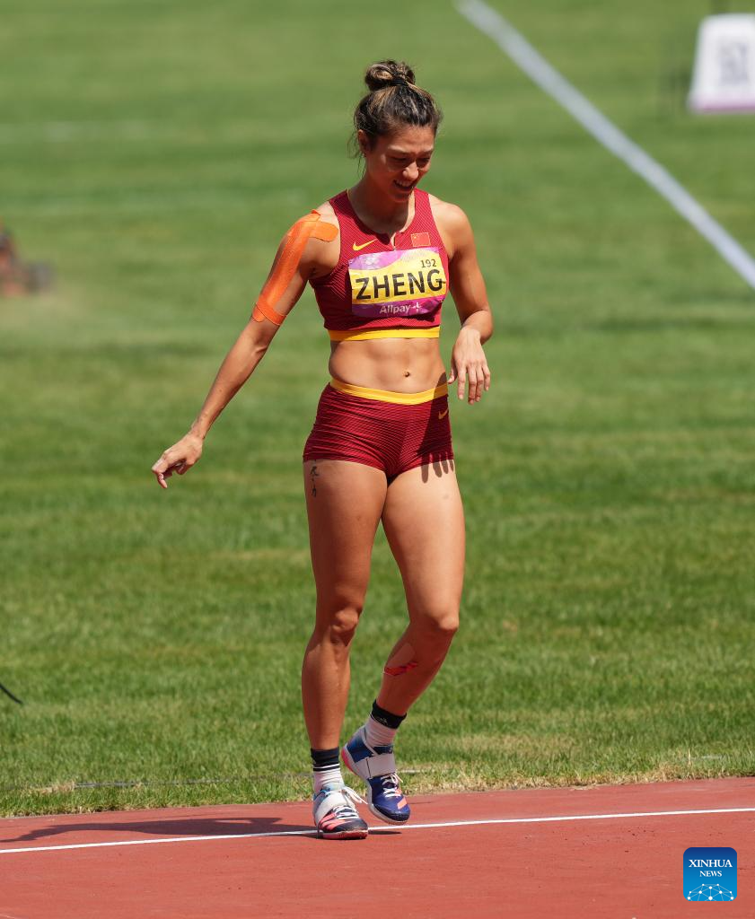 Zheng Ninali of China reacts during the Women's Heptathlon Javelin Throw of Athletics at the 19th Asian Games in Hangzhou, east China's Zhejiang Province, Oct. 1, 2023. (Xinhua/Sun Fei)