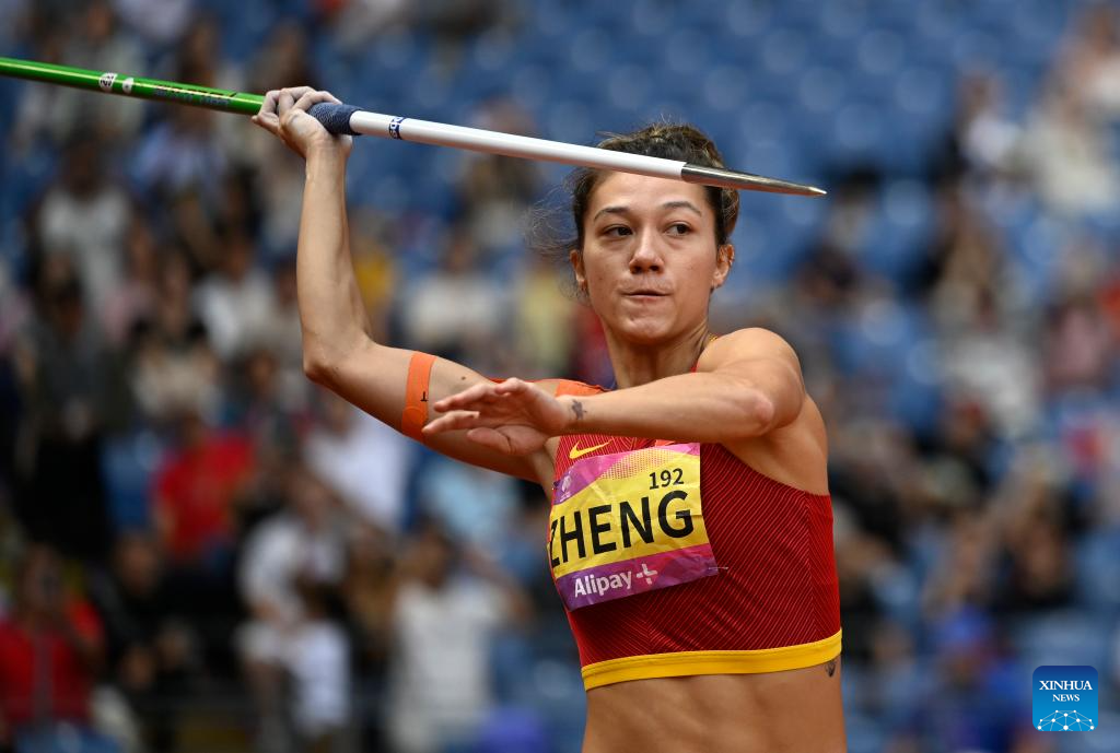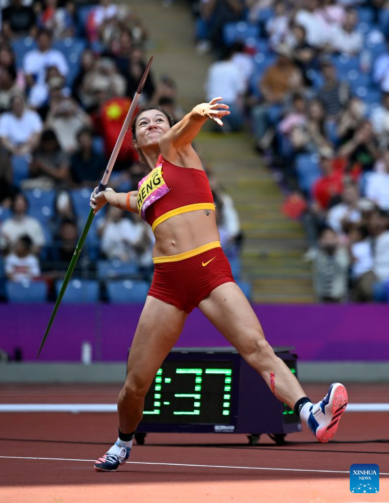 Zheng Ninali of China competes during the Women's Heptathlon Javelin Throw of Athletics at the 19th Asian Games in Hangzhou, east China's Zhejiang Province, Oct. 1, 2023. (Xinhua/Song Yanhua)