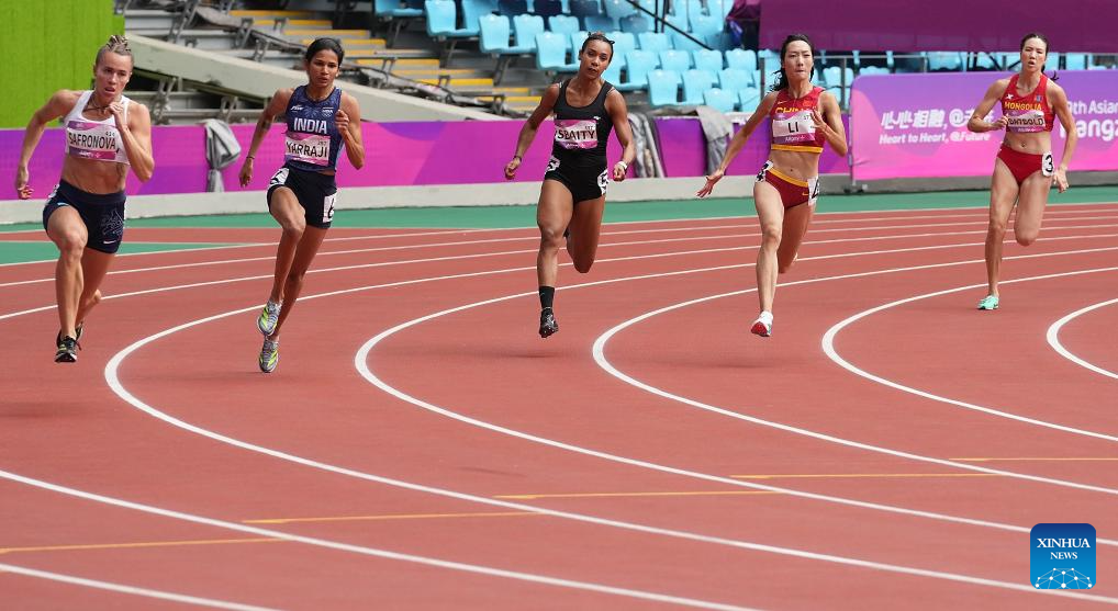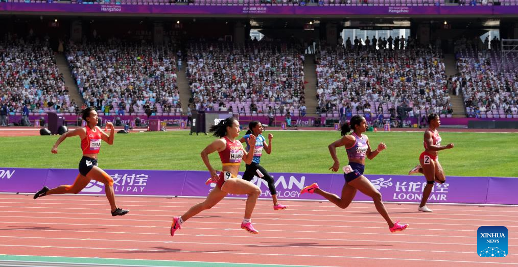 Huang Guifen(2nd L) of China competes during the Women's 200m Heat of Athletics at the 19th Asian Games in Hangzhou, east China's Zhejiang Province, Oct. 1, 2023. (Xinhua/Sun Fei)
