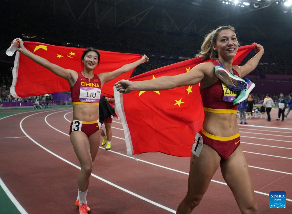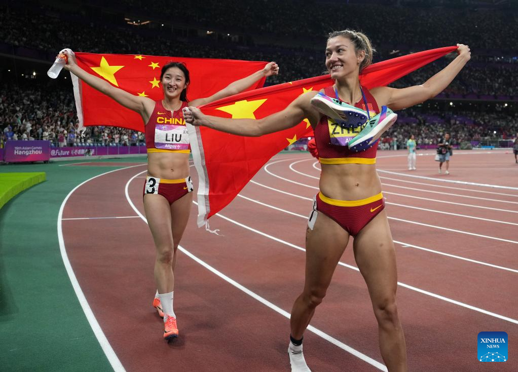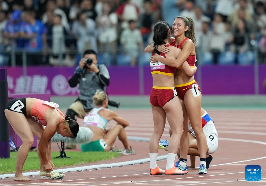 Zheng Ninali(R) of China and Liu Jingyi of China celebrate after the Women's Heptathlon 800m of Athletics at the 19th Asian Games in Hangzhou, east China's Zhejiang Province, Oct. 1, 2023. (Xinhua/Li Yibo)