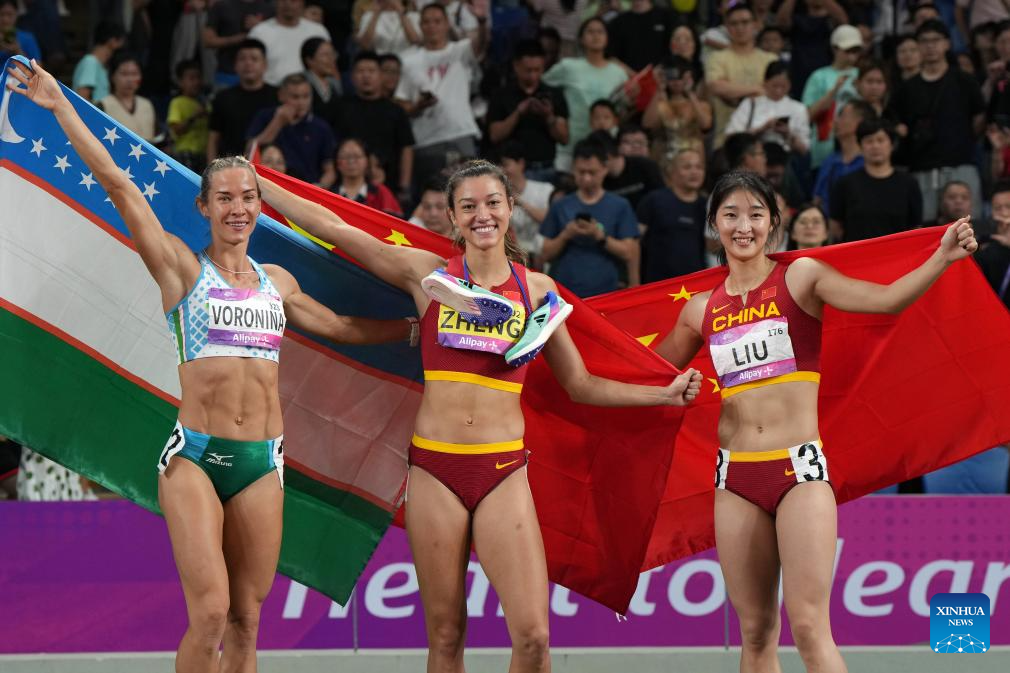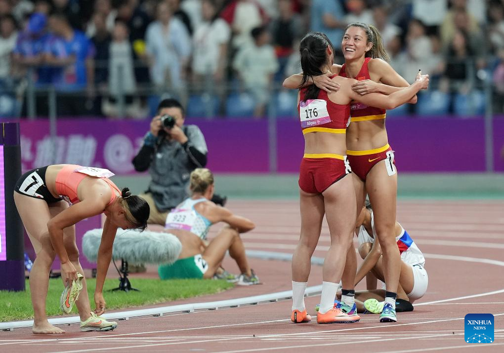 Zheng Ninali(C) of China, Liu Jingyi(R) of China and Ekaterina Voronina of Uzbekistan celebrate after the Women's Heptathlon 800m of Athletics at the 19th Asian Games in Hangzhou, east China's Zhejiang Province, Oct. 1, 2023. (Xinhua/Li Yibo)