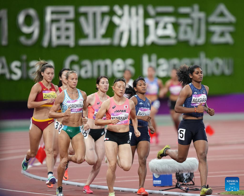 Athletes compete during the Women's Heptathlon 800m of Athletics at the 19th Asian Games in Hangzhou, east China's Zhejiang Province, Oct. 1, 2023. (Xinhua/Sun Fei)