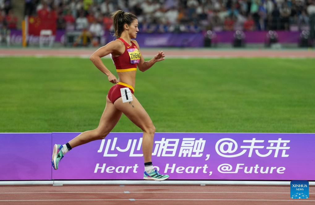 Zheng Ninali of China competes during the Women's Heptathlon 800m of Athletics at the 19th Asian Games in Hangzhou, east China's Zhejiang Province, Oct. 1, 2023. (Xinhua/Sun Fei)