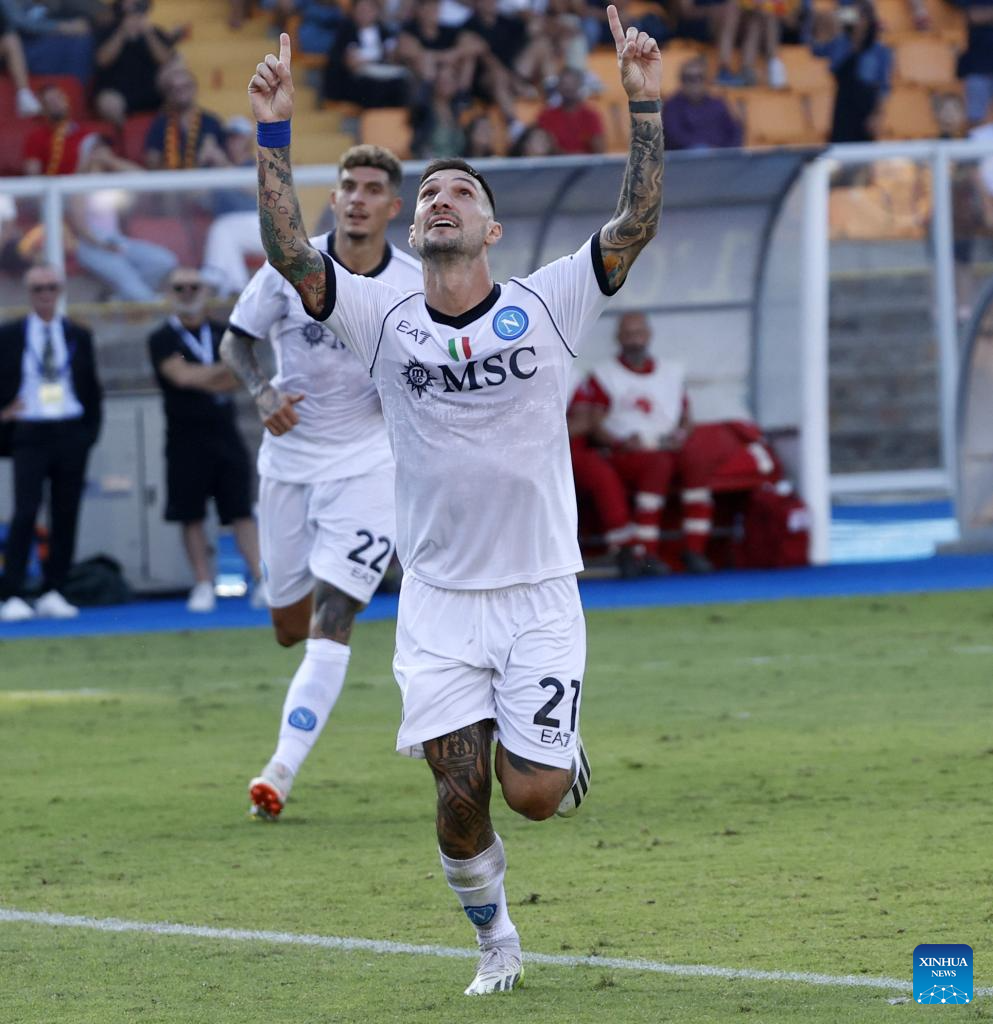 Napoli's Matteo Politano celebrates his goal during a Serie A football match between Lecce and Napoli in Lecce, Italy, Sept. 30, 2023. (Photo by Augusto Casasoli/Xinhua)