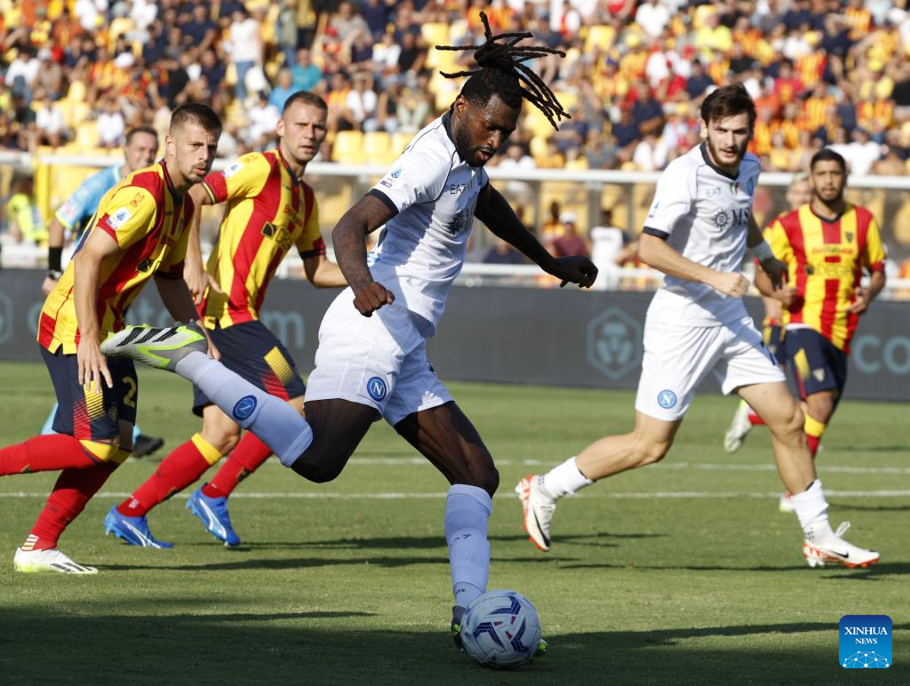 Napoli's Andre-Frank Zambo Anguissa (front) competes during a Serie A football match between Lecce and Napoli in Lecce, Italy, Sept. 30, 2023. (Photo by Augusto Casasoli/Xinhua)