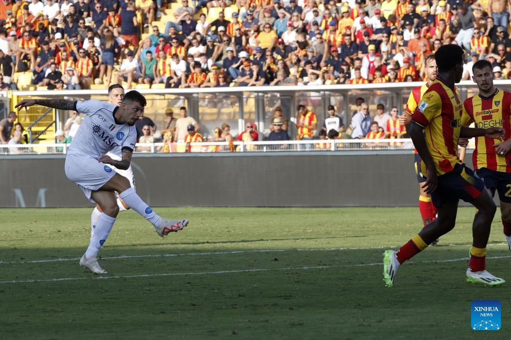 Napoli's Gianluca Gaetano shoots during a Serie A football match between Lecce and Napoli in Lecce, Italy, Sept. 30, 2023. (Photo by Augusto Casasoli/Xinhua)