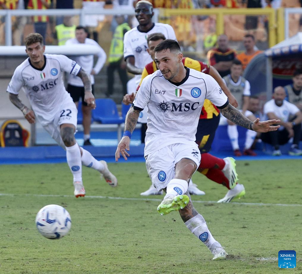 Napoli's Matteo Politano (front) shoots and scores the penalty kick during a Serie A football match between Lecce and Napoli in Lecce, Italy, Sept. 30, 2023. (Photo by Augusto Casasoli/Xinhua)
