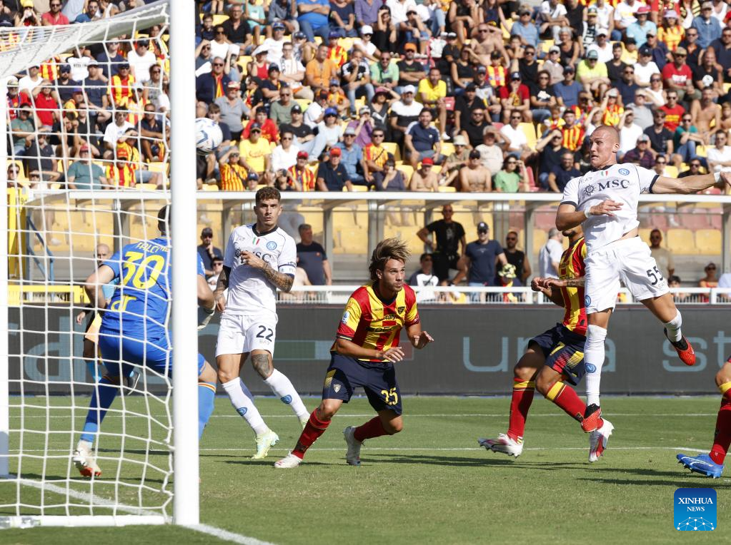 Napoli's Leo Ostigard (1st R) heads for the ball during a Serie A football match between Lecce and Napoli in Lecce, Italy, Sept. 30, 2023. (Photo by Augusto Casasoli/Xinhua)
