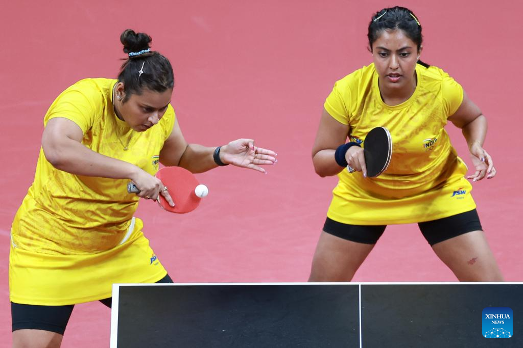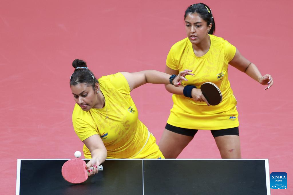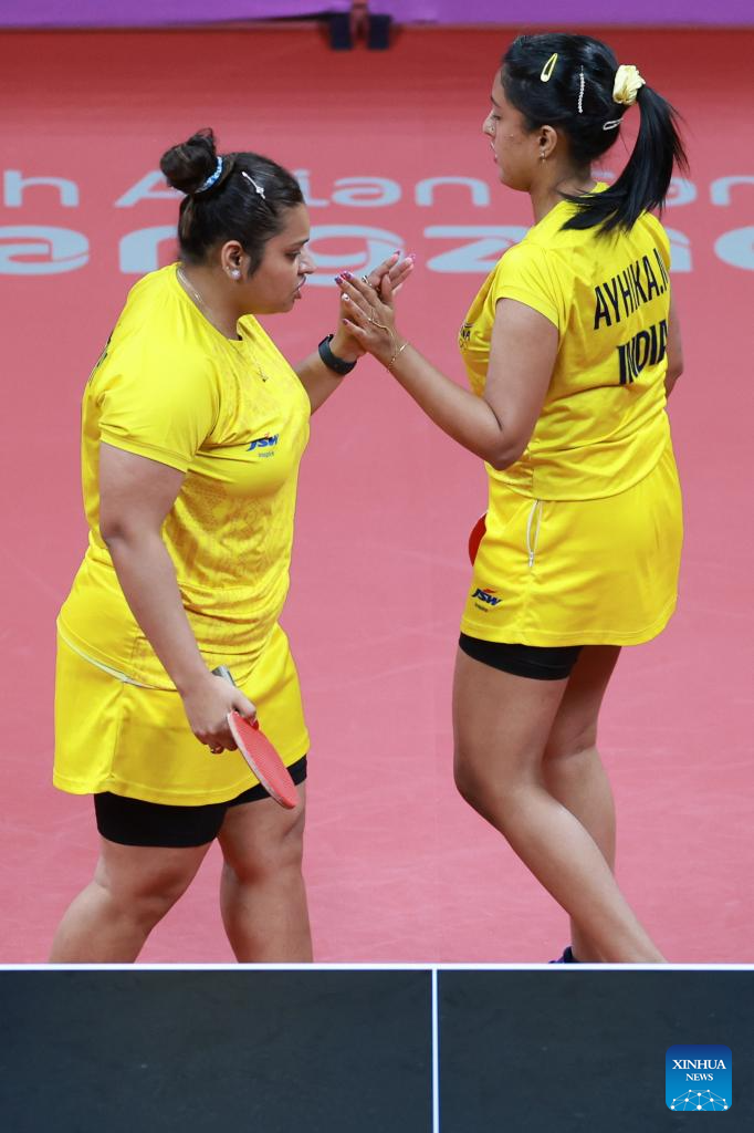 Sutirtha Mukherjee(L)/Ayhika Mukherjee of India compete during the Women's Doubles Semifinal Match of table tennis between Cha Suyong/Pak Sugyong of the Democratic People's Republic of Korea (DPRK) and Sutirtha Mukherjee/Ayhika Mukherjee of India at the 19th Asian Games in Hangzhou, east China's Zhejiang Province, Oct. 2, 2023. (Xinhua/Liu Xu)