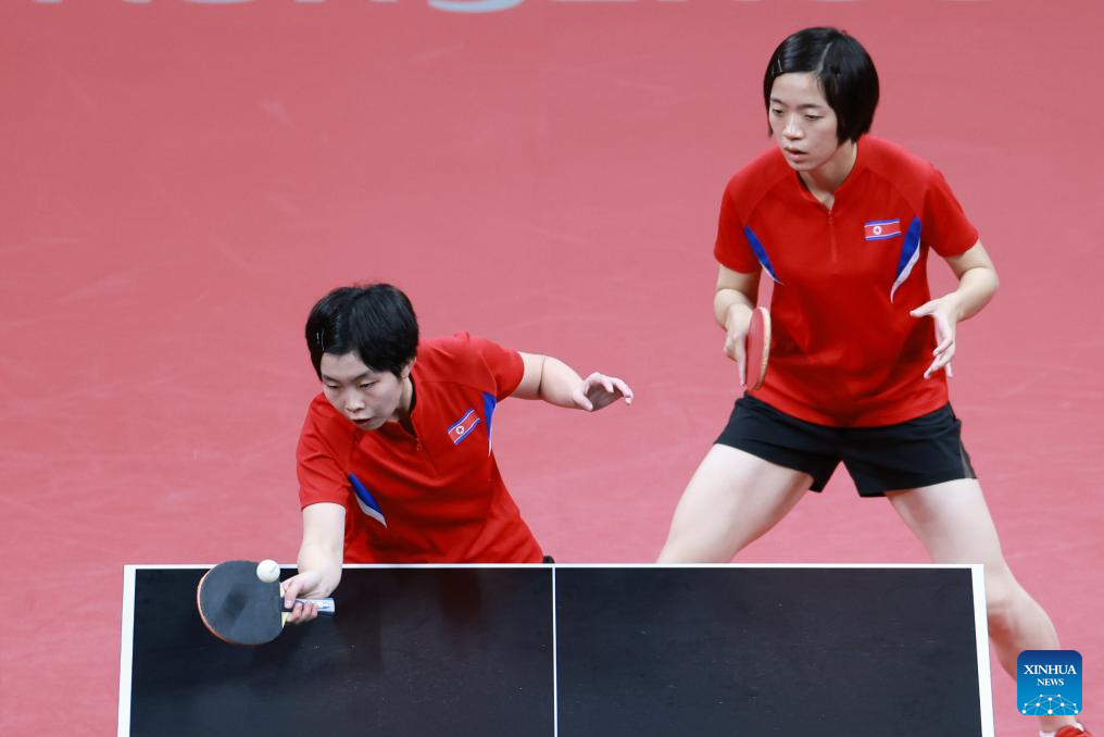 Cha Suyong(L)/Pak Sugyong of the Democratic People's Republic of Korea (DPRK) compete during the Women's Doubles Semifinal Match of table tennis between Cha Suyong/Pak Sugyong of the Democratic People's Republic of Korea (DPRK) and Sutirtha Mukherjee/Ayhika Mukherjee of India at the 19th Asian Games in Hangzhou, east China's Zhejiang Province, Oct. 2, 2023. (Xinhua/Liu Xu)