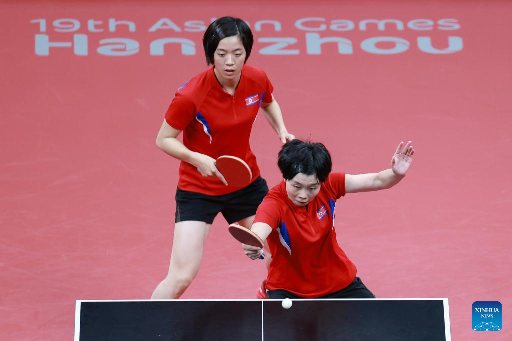 Cha Suyong(R)/Pak Sugyong of the Democratic People's Republic of Korea (DPRK) compete during the Women's Doubles Semifinal Match of table tennis between Cha Suyong/Pak Sugyong of the Democratic People's Republic of Korea (DPRK) and Sutirtha Mukherjee/Ayhika Mukherjee of India at the 19th Asian Games in Hangzhou, east China's Zhejiang Province, Oct. 2, 2023. (Xinhua/Liu Xu)