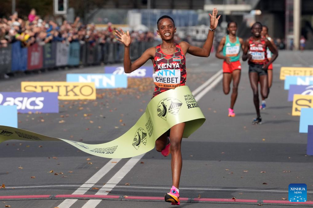First place winner Peres Jepchirchir of Kenya celebrates during the awarding ceremony for women's 21km race at the World Athletics Road Running Championships Riga 23 in Riga, Latvia, Oct. 1, 2023. (Photo by Edijs Palens/Xinhua)
