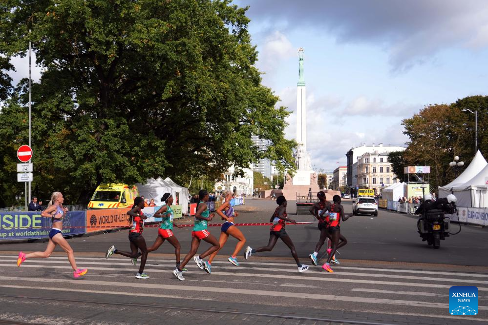 Competitors compete during the women's 21km race at the World Athletics Road Running Championships Riga 23 in Riga, Latvia, Oct. 1, 2023. (Photo by Edijs Palens/Xinhua)