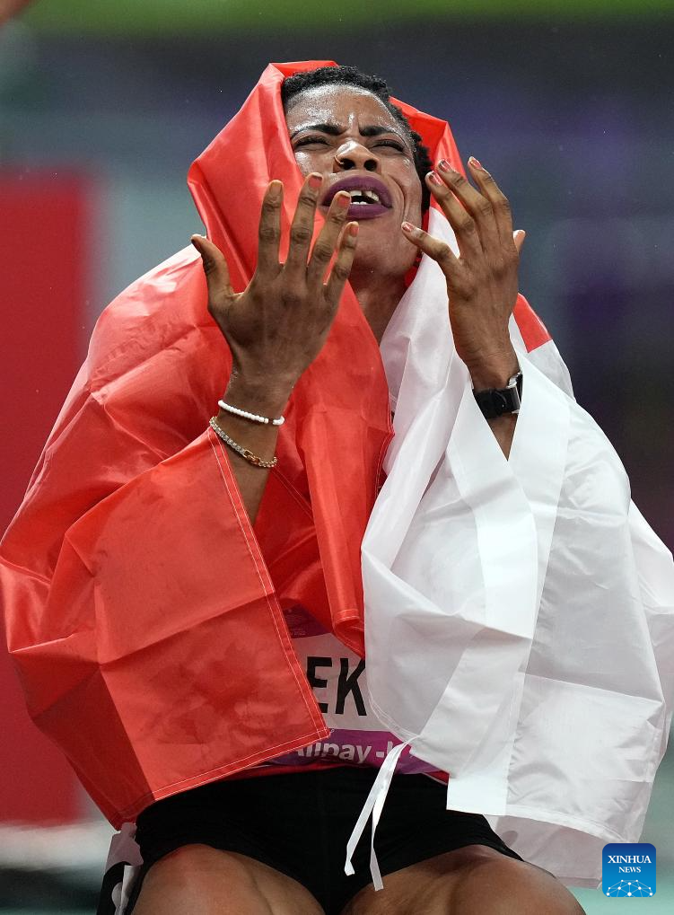 Oluwakemi Mujidat Adekoya of Bahrain celebrates after the Women's 400m Hurdles Final of Athletics at the 19th Asian Games in Hangzhou, east China's Zhejiang Province, Oct. 3, 2023. (Xinhua/Sun Fei)