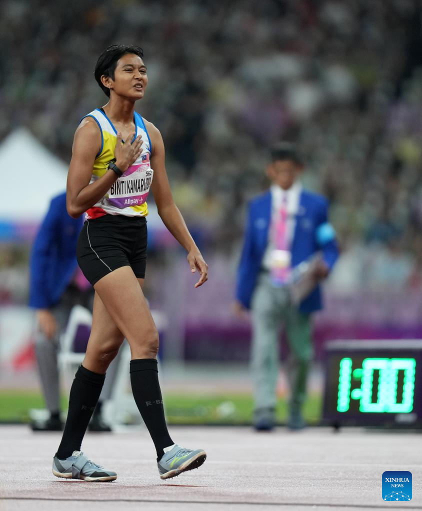 Norliyana Binti Kamaruddin of Malaysia reacts during the Women's High Jump Final of Athletics at the 19th Asian Games in Hangzhou, east China's Zhejiang Province, Oct. 3, 2023. (Xinhua/Sun Fei)