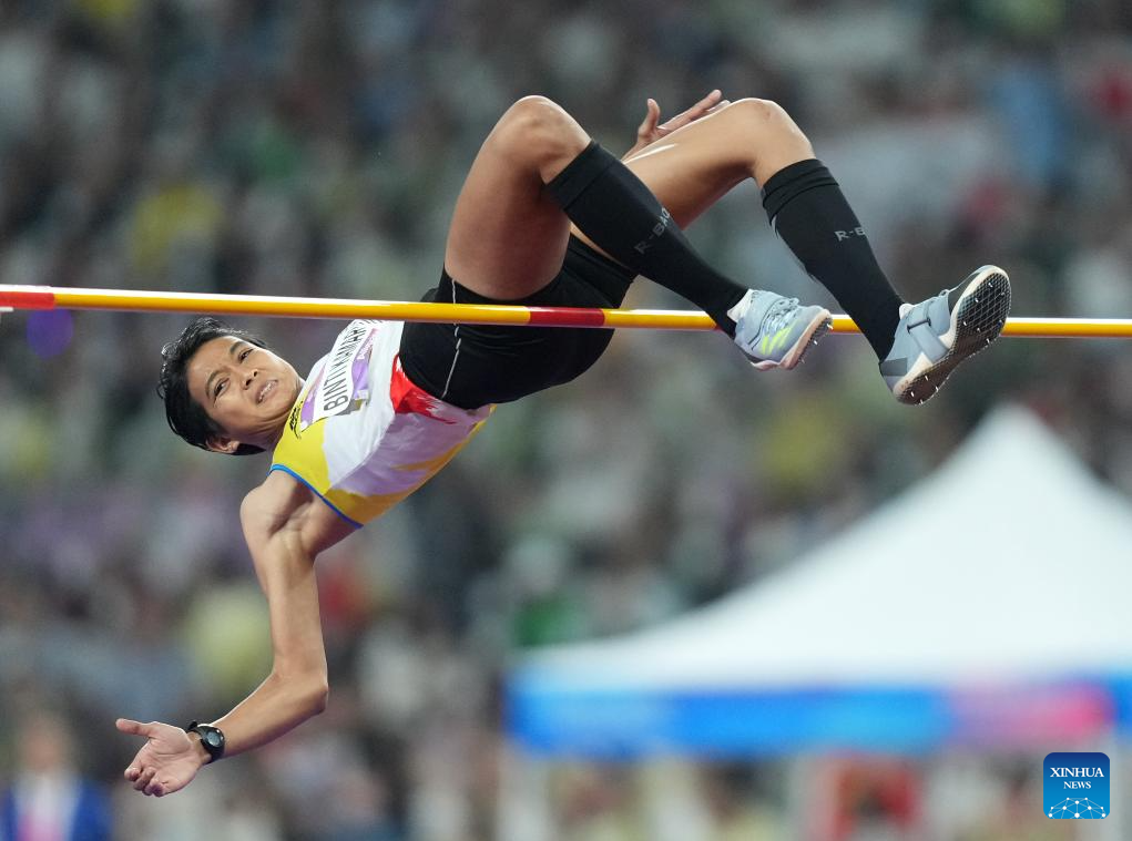 Norliyana Binti Kamaruddin of Malaysia competes during the Women's High Jump Final of Athletics at the 19th Asian Games in Hangzhou, east China's Zhejiang Province, Oct. 3, 2023. (Xinhua/Sun Fei)