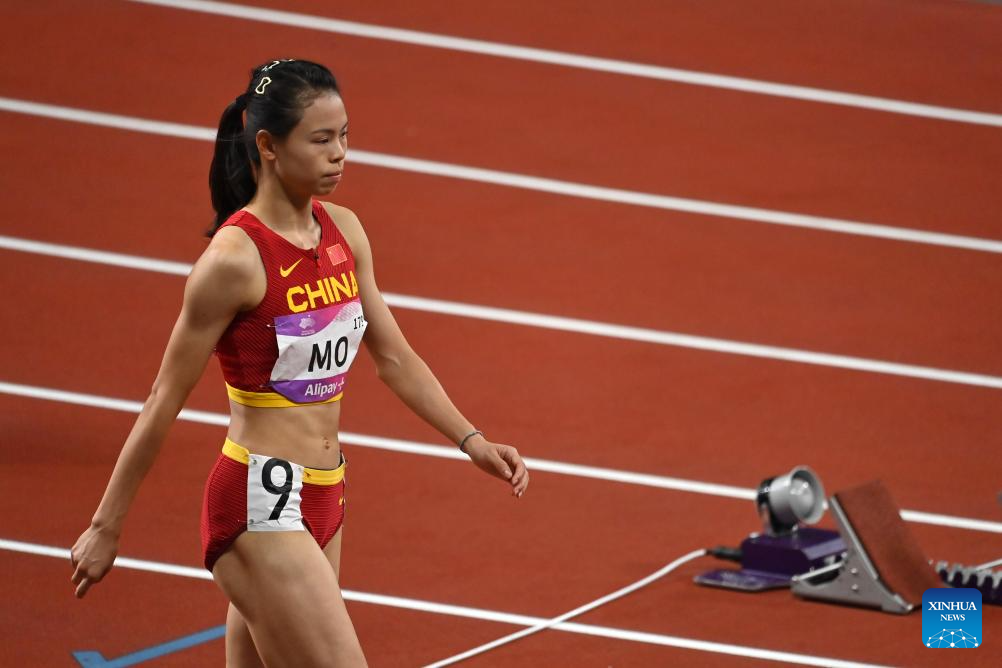 Mo Jiadie of China reacts before the Women's 400m Hurdles Final of Athletics at the 19th Asian Games in Hangzhou, east China's Zhejiang Province, Oct. 3, 2023. (Xinhua/Jiang Han)